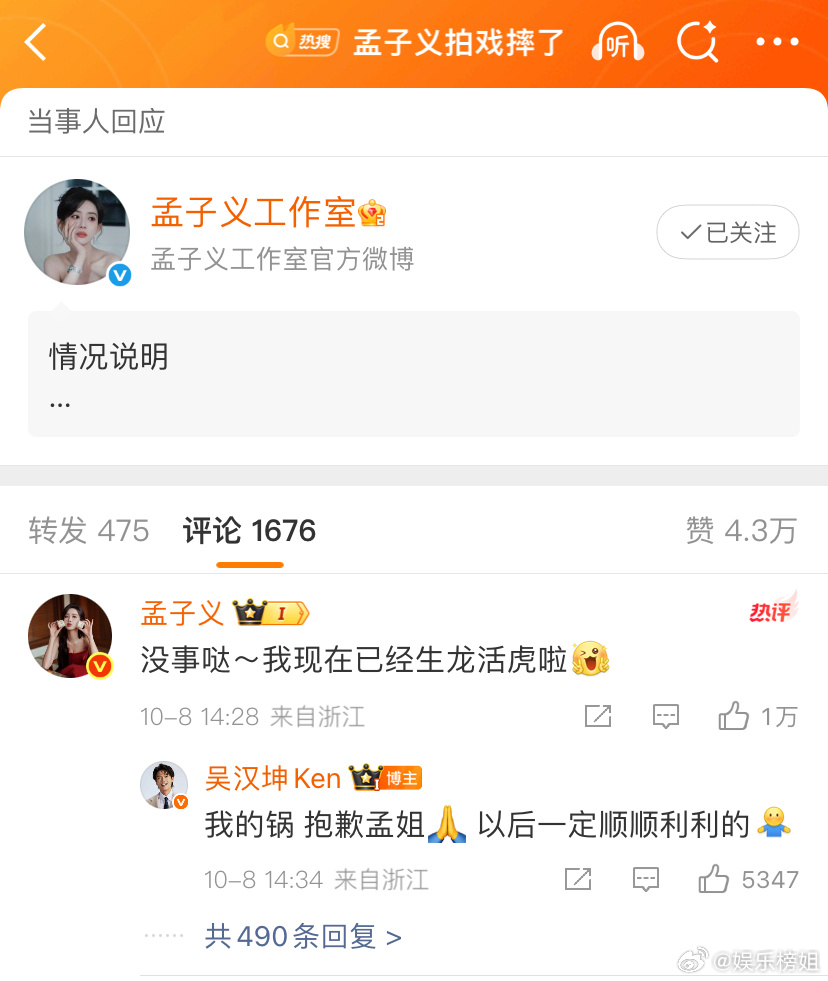 孟子义回复吴汉坤孟子义回应吴汉坤道歉:没事哒~我现在已经生龙活虎啦[比耶]孟子