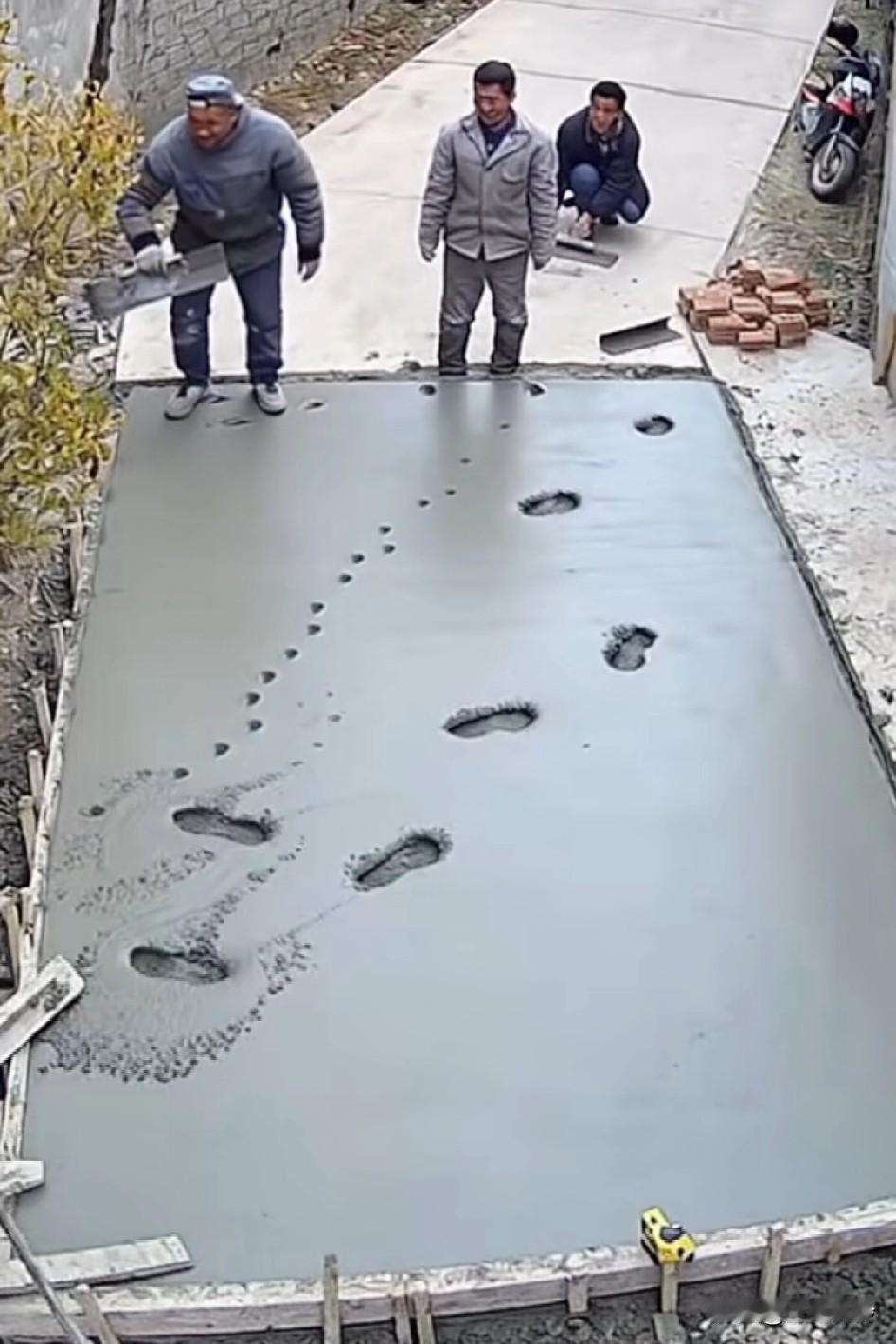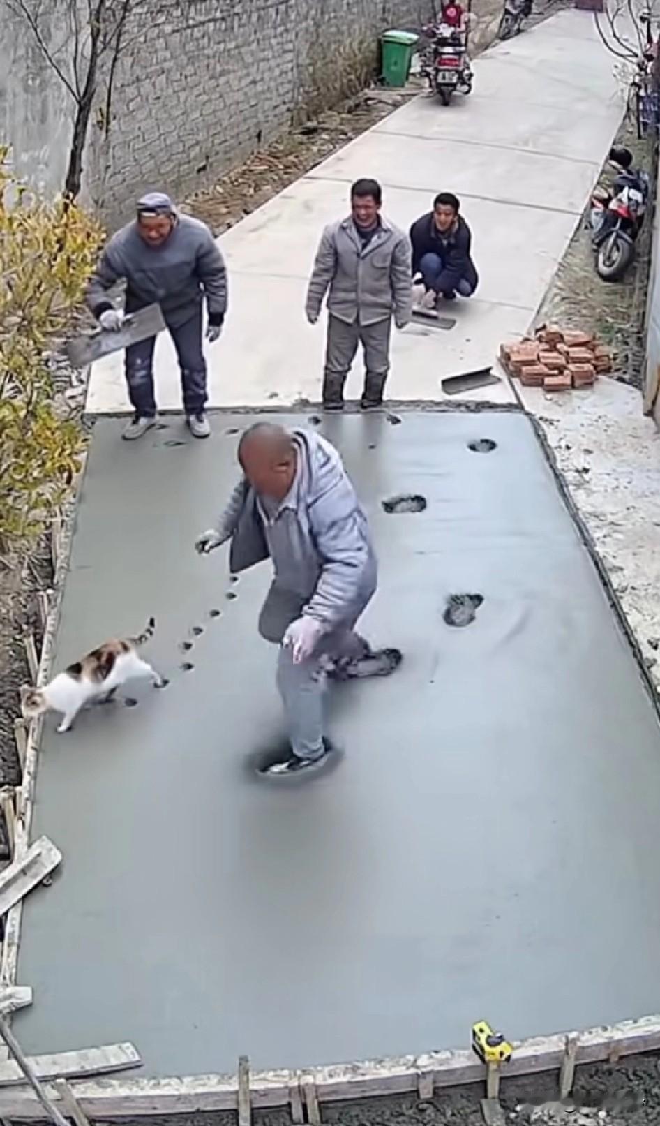 气到爆炸,自己踩的比猫还厉害, 猫:想收工没门,看我给你走两步… 猫咪说,让我来给你们锈个花,你们人类急个啥呢,哈哈,下意识反应,又得多工作一个小时,那两个应该去追光老头,要踩一起踩。那个人说去追,抓回来又可以怎么样,这个脚印要是能留下来,绝对是精品