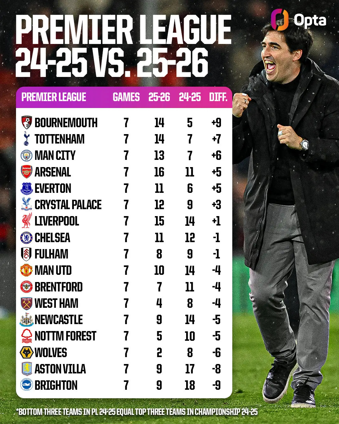 图片通过直观的数据对比和生动的视觉元素,全面呈现了英超联赛2025-26赛季与2024-25赛季前7轮的积分变化情况: