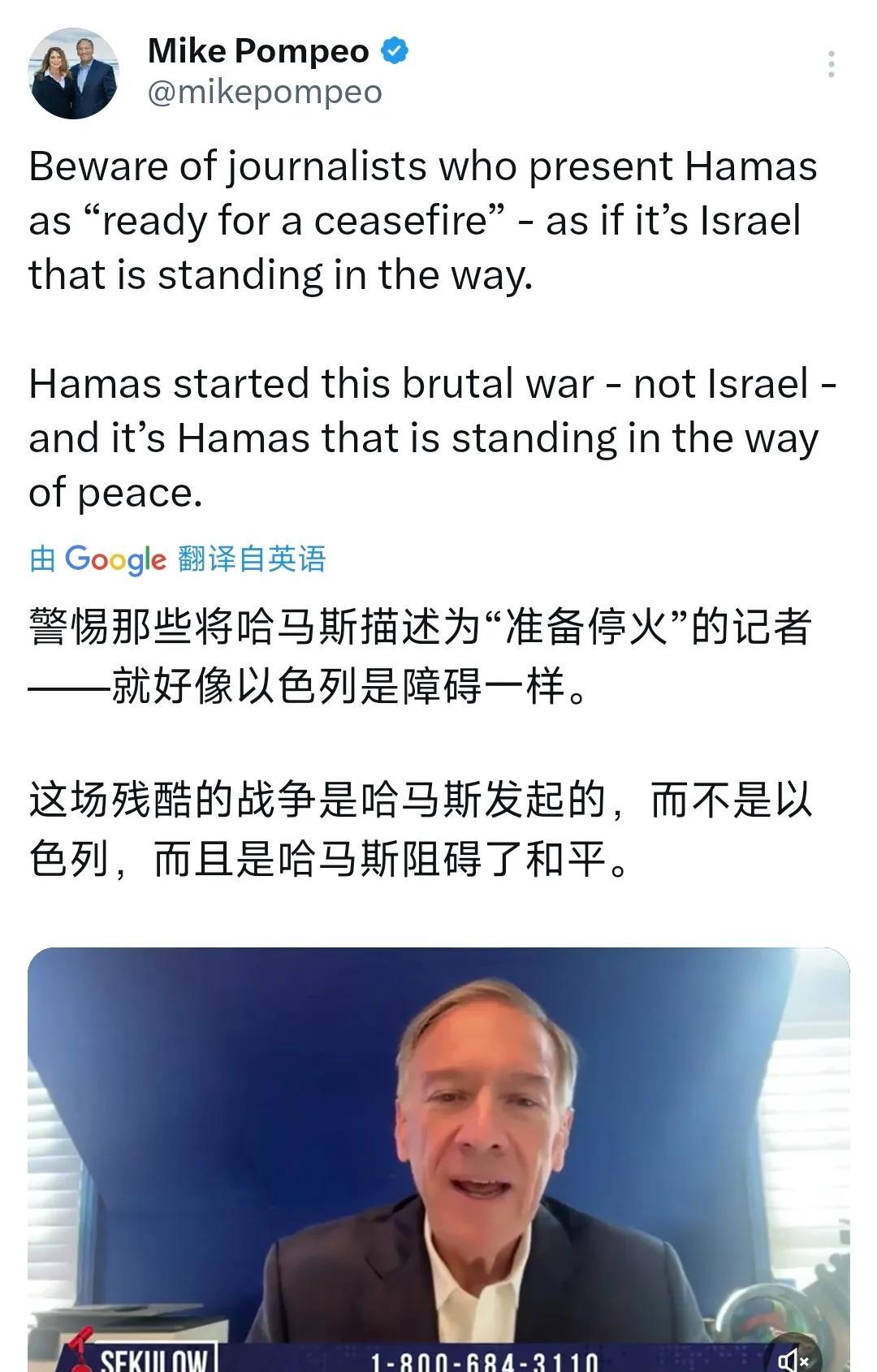 美国前国务卿蓬佩奥今天(10月8日)写道:“警惕那些将哈马斯描述为‘准备停火’的