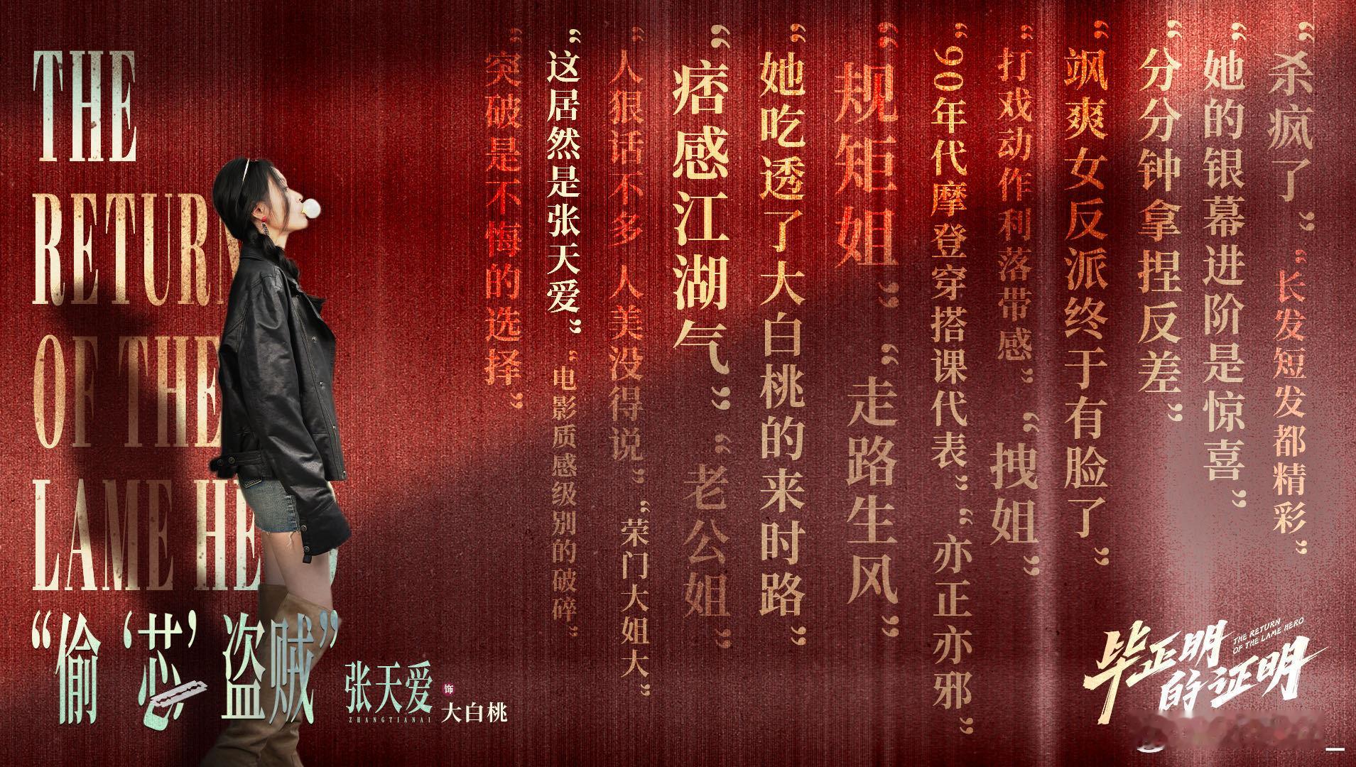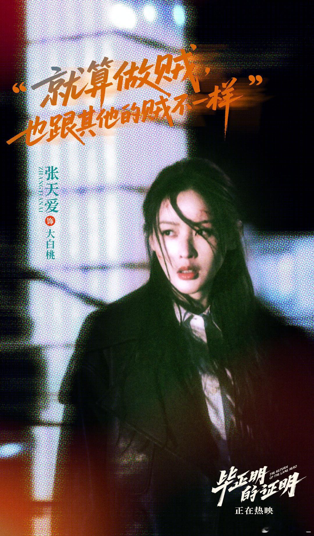 张天爱实在太适合大银幕了张天爱与大银幕的适配度,在《毕正明的证明》里藏不住!演“大白桃”时,利落短发是江湖女贼的飒,大波浪港风是角色的变装魅力,一个眼神就带满故事感;她精准抓住角色“没得选”的无奈与“想换活法”的挣扎,把亦正亦邪的张力演到骨子里,谁看了不说一句“请和大银幕焊死”!