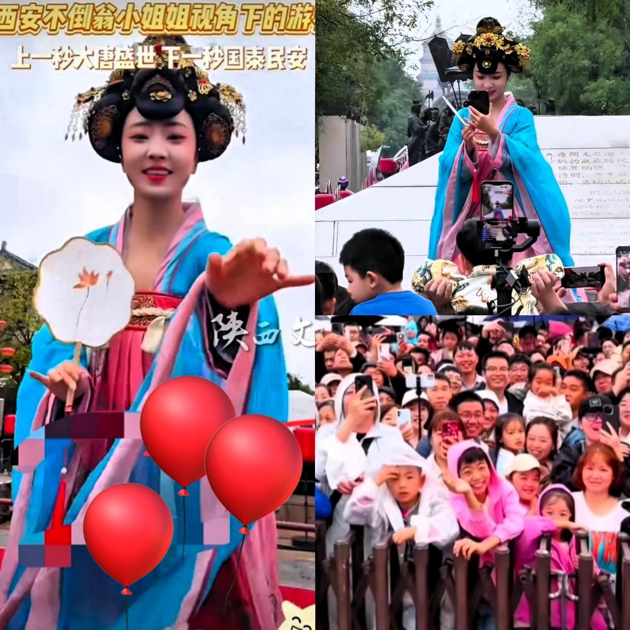 最近在西安大唐不夜城, 不倒翁小姐姐表演时玩了个大花活!她一时兴起,拿过游客手机