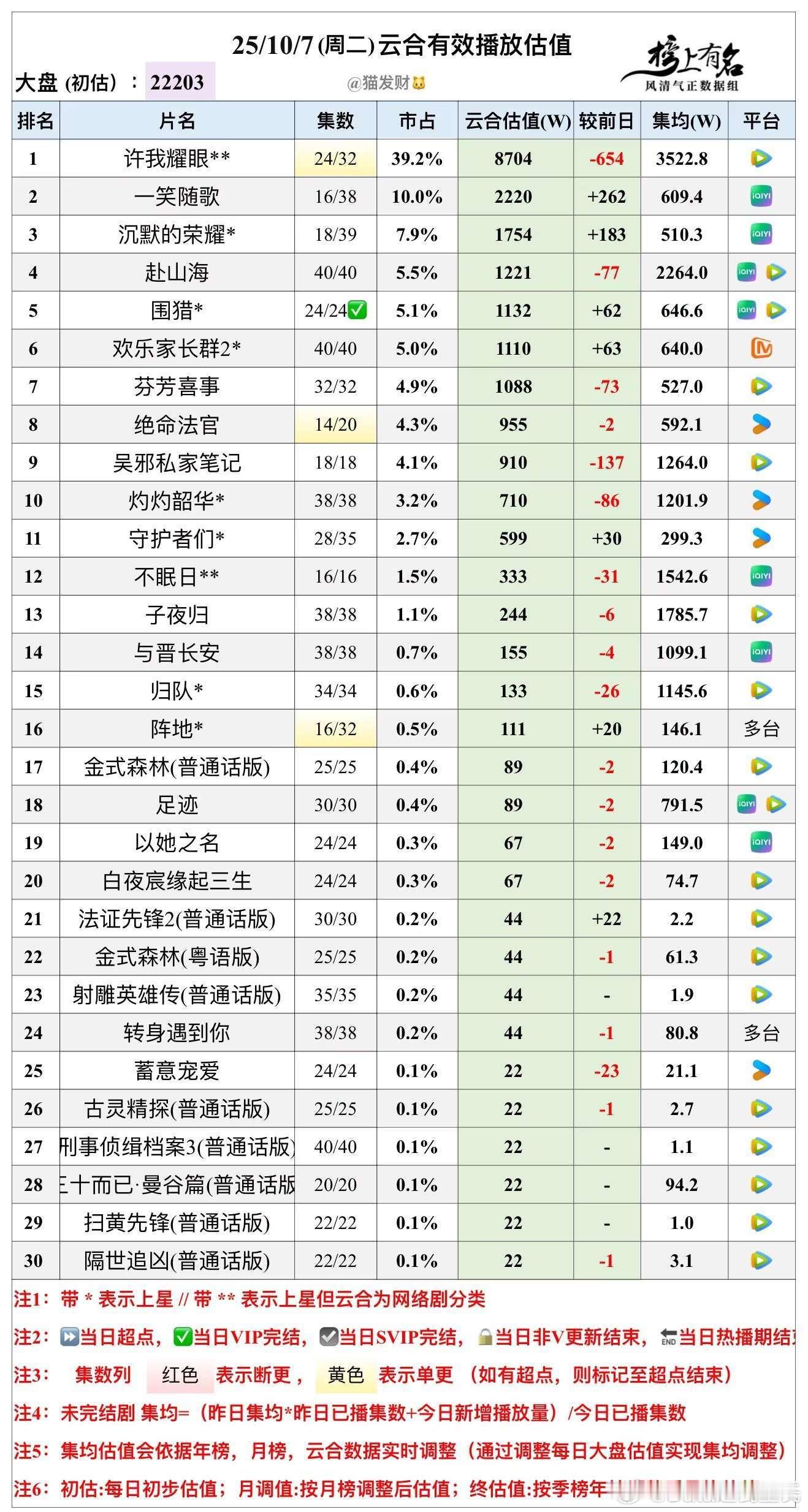 10.7云合播放量估值,大盘22203w