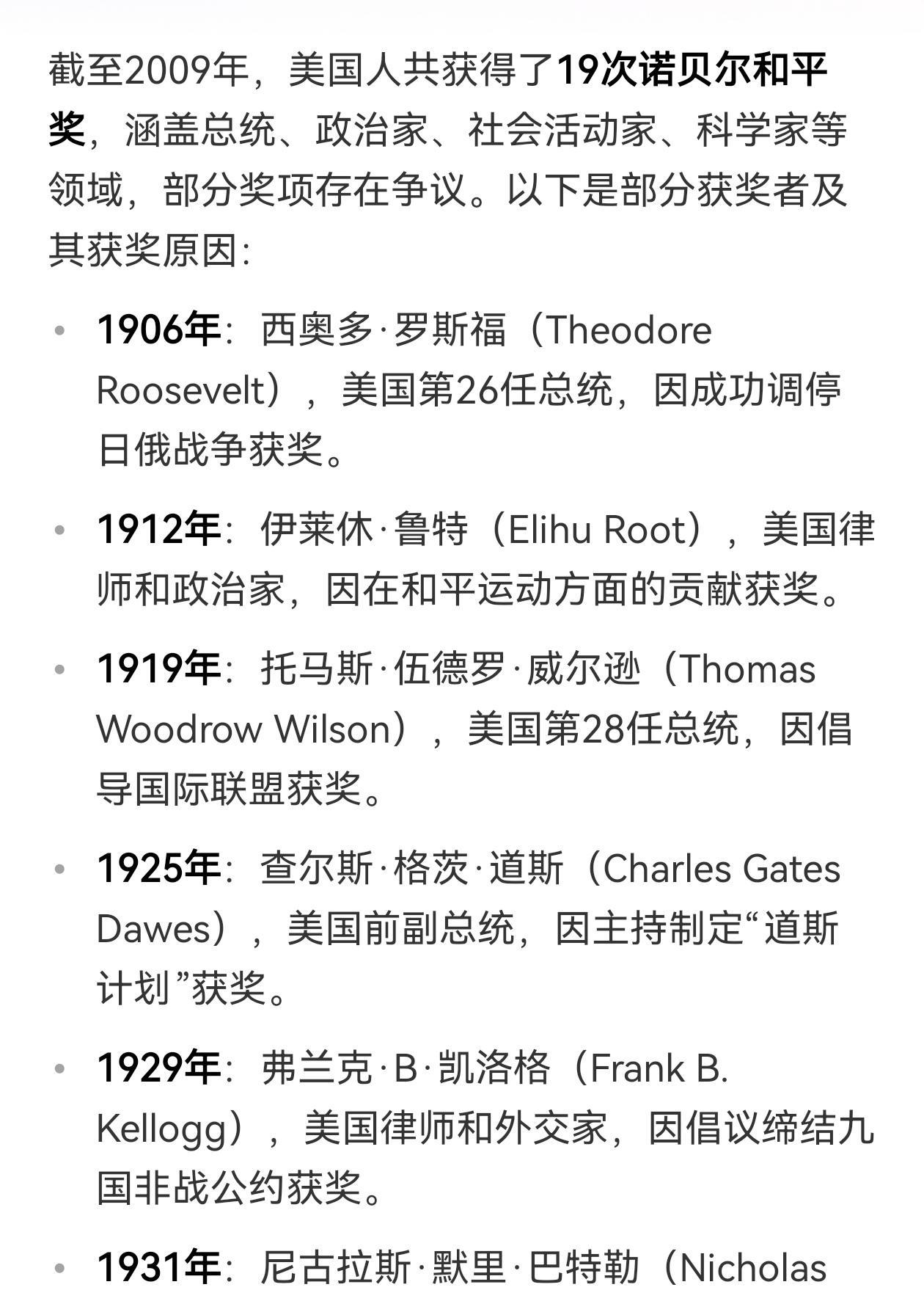 美国建国249年,只有16年没打仗,不是挑起战争就是发动战争,在全球80多个国家建有800多个军事基地,从阿富汗到伊拉克,从叙利亚到利比亚,美国的战争机器碾过哪里,哪里的民众陷入水深火热之中。但诺贝尔和平奖却异常钟爱美国,截止2009年,美国人共获奖19次。美国总统特朗普说,他上任8个月解决了8场战争(包括巴以冲突),如果他未能获得此奖,这将是对美国“极大的侮辱”。10月10日又是获奖提名日,特朗普能如愿以偿吗?