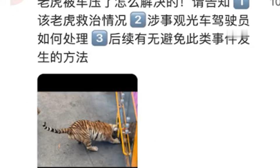 10月8日,游客称在大连森林动物园猛虎区,看到一只老虎在咬游客观光车的轮胎时,被车压到了下巴。现场有很多人都听到了明显的“喀嚓声”,老虎疼的嘴巴都闭不上了。游客很快将此事反馈给动物园工作人员。 对此,大连森林动物园工作人员回应:不是车压到老虎,游客听到的喀嚓声是老虎咬轮胎的声音。饲养员和兽医已经检查过了,初步判断无重大伤情,会继续观察老虎状态。 目前,猛虎区的观光车仍在正常行驶。 网友质疑该动物园工作人员对老虎照顾不周,视频里的几只老虎都很瘦,怀疑老虎吃不饱才去啃食轮胎。 光观车都能压到老虎嘴巴,动物园不能光赚钱,对动物连个基本的安全保障都做不到。给老虎做个检查公布伤情,给观光车做好安全防护,制止部分游客乱投喂,有理有据有后续措施,谁还喷你!