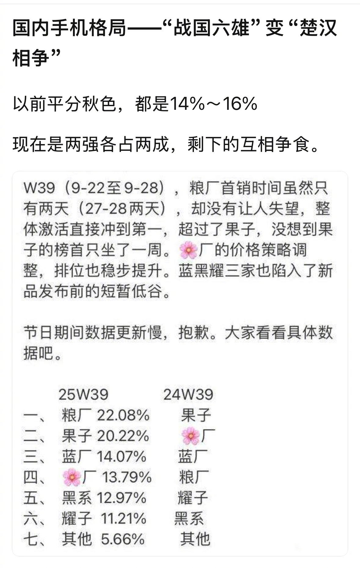 松山村人 1 2025-10-09 01:19 没有什么不可能!再牛逼有白搭,有永远的锦绣江山没有永远的王。三星能被挤出去,苹果也不是不可能。广积粮缓称王……华为小米演双簧,还有几家厉兵秣马也预备着个人终端的逐鹿问鼎大乱战