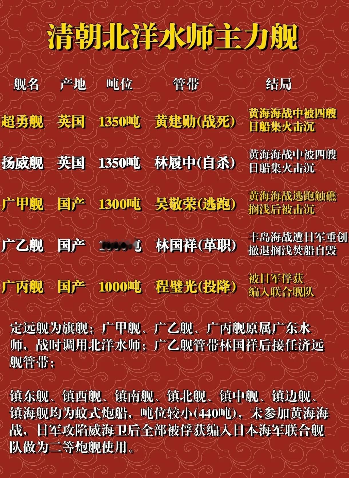 1894年,北洋水师先在甲午海战中折损“致远”“经远”等5艘主力舰,元气大伤。随后日军海陆夹击,1895年1月攻陷威海卫南岸、北岸炮台,将剩余的“定远”“镇远”“靖远”等舰困在刘公岛港湾。 港口被日军舰艇封锁,陆地炮台又被日军控制,北洋舰队外无援军,内缺弹药,败局早已注定。 舰队残部人心涣散。有人私下议论投降,有人甚至开始偷偷转移个人物品。道台牛昶炳当时负责刘公岛的民政与水师后勤,他找到镇远舰继任舰长杨永林。 镇远舰是北洋舰队仅剩的两艘铁甲舰之一,杨永林虽刚接手,但在水兵中有些威望。 道台牛昶炳劝他,以舰队代表身份去跟日军谈判,能保住剩下人的性命。 杨永林当场拒绝。他从军多年,亲历北洋舰队成军后的数次远航,始终以水师尊严为重。他把牛昶炳等人骂走,说北洋水师就算打光了,也不能丢大清的脸。 拒绝投降后,杨永林选择了殉国。他在船舱里吟出“人生自古谁无死,留取丹心照汗青”,随后拿起长枪,枪口对准咽喉,用脚趾扣动扳机。 这一枪,成了北洋水师的最后一枪,也是这支舰队最后的抗争。 同一晚,北洋水师提督丁汝昌收到山东巡抚李秉衡,从烟台发来的密电。 电文明确说,援军多次被日军截击,无法抵达威海卫,让他们自行设法突围。丁汝昌知道,这是朝廷最后的答复,刘公岛已成孤岛。 他立刻召集剩余将领。当时舰上还有“镇远”“靖远”等几艘能作战的军舰,他提议集中所有火力,趁夜强行突围,哪怕能冲出几艘,也算为北洋舰队留些根基。 但多数将领反对,有人说军舰燃煤不足,突围跑不远;有人说日军火力太猛,突围就是送死,还有人直接主张投降。 将领们吵了几句,便各自散去,只留下丁汝昌一人在指挥舱。他的处境本就艰难。1894年11月,日军进攻旅顺,他因未能率舰及时支援,被清廷革去尚书衔,摘去顶戴花翎。旅顺陷落后,他又被革职,却因舰队无人接手,被迫留任戴罪立功。 后来威海布防,他见陆军兵力薄弱,担心海岸炮台守不住,建议提前炸毁炮台,避免被日军利用来攻击港内军舰。这个合理建议,却被人弹劾为“通敌误国”,清廷下旨要将他押解刑部治罪。多亏刘步蟾、林泰曾等将领联名通电请愿,李鸿章也在朝堂上极力申辩,说他是顾全大局,清廷才暂缓治罪,让他先处理完威海事务再赴京。 丁汝昌心里清楚,自己是戴罪之身,就算突围成功,战后也难逃清廷的追责处死。几天前,他已悄悄请工匠在舰上打了一口棺材,还亲自躺进去试过尺寸。 万念俱灰下,59岁的丁汝昌,拿出早已备好的大烟,一口口吞了下去,自尽在他坚守的战舰上。 同晚,刘公岛护军统领张文宣也选择了自杀。他是李鸿章的外甥,却从未靠亲属关系谋私,主动请缨驻守刘公岛。 陆地炮台陷落后,他带着护军在岛上苦苦支撑,弹尽粮绝后,得知丁汝昌自尽,也随之殉国,践行了“与刘公岛共存亡”的誓言。 2月12日,牛昶炳不再等待。他联合“镇远”舰管带杨用霖等几名官员,没与其他官兵商量,直接假借丁汝昌的名义起草投降书。 随后,有人在刘公岛旗杆上降下北洋舰队的黄龙旗,挂上了白旗。 舰长程璧光被推为代表,拿着投降书登上小艇,前往日军联合舰队旗舰“松岛”号谈判。 谈判时,牛昶炳还想讨巧,跟日军司令伊东佑亨说,“广丙”舰属于广东水师,只是临时来北洋参加演习,并未正式编入北洋舰队,请求日方将其放回广东水师。 伊东佑亨直接拒绝,称“广丙”舰参与了威海卫作战,已属北洋舰队作战序列,没有单独放回的道理。 牛昶炳无奈,只能交出早已统计好的投降名册。名册上写明,投降的清军包括陆军2040人、海军3084人,合计5124人。 其实北洋舰队的覆灭,早有伏笔。 1894年9月的大东沟海战,并非单纯的舰队对决——北洋舰队本是为掩护增援朝鲜的清军船队而行,途中遭遇日本海军主力。 此战北洋虽损失“致远”“经远”等5舰,却成功完成了护送清军的目标。代价是制海权旁落,日军得以从容施展后续计谋。 同年10月,日军效仿历史上的登陆战术,从花园口绕道登陆,突袭旅顺港。 北洋舰队被迫撤出,彻底失去了机动能力,只能退守威海卫。 此时,丁汝昌与李鸿章早已察觉日军意图,多次请求山东巡抚李秉衡派兵增援,防备日军故技重施、从陆路绕道登陆威海。 可李秉衡与李鸿章素有过节,竟公报私仇,仅派几百民团应付,未作有效布防。 1895年1月,日军果然再次绕道登陆,轻松拿下威海周边所有炮台,随即调转炮口轰击港内北洋舰船。 外无援军、内受夹击,这支曾号称“亚洲第一”的舰队,最终走向覆灭。