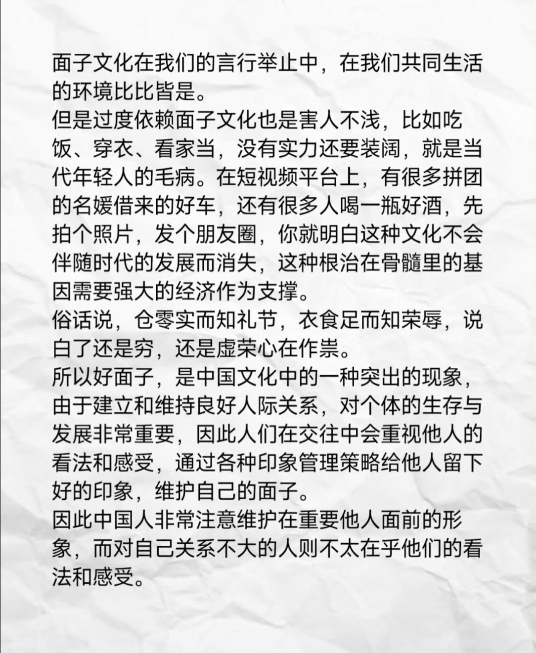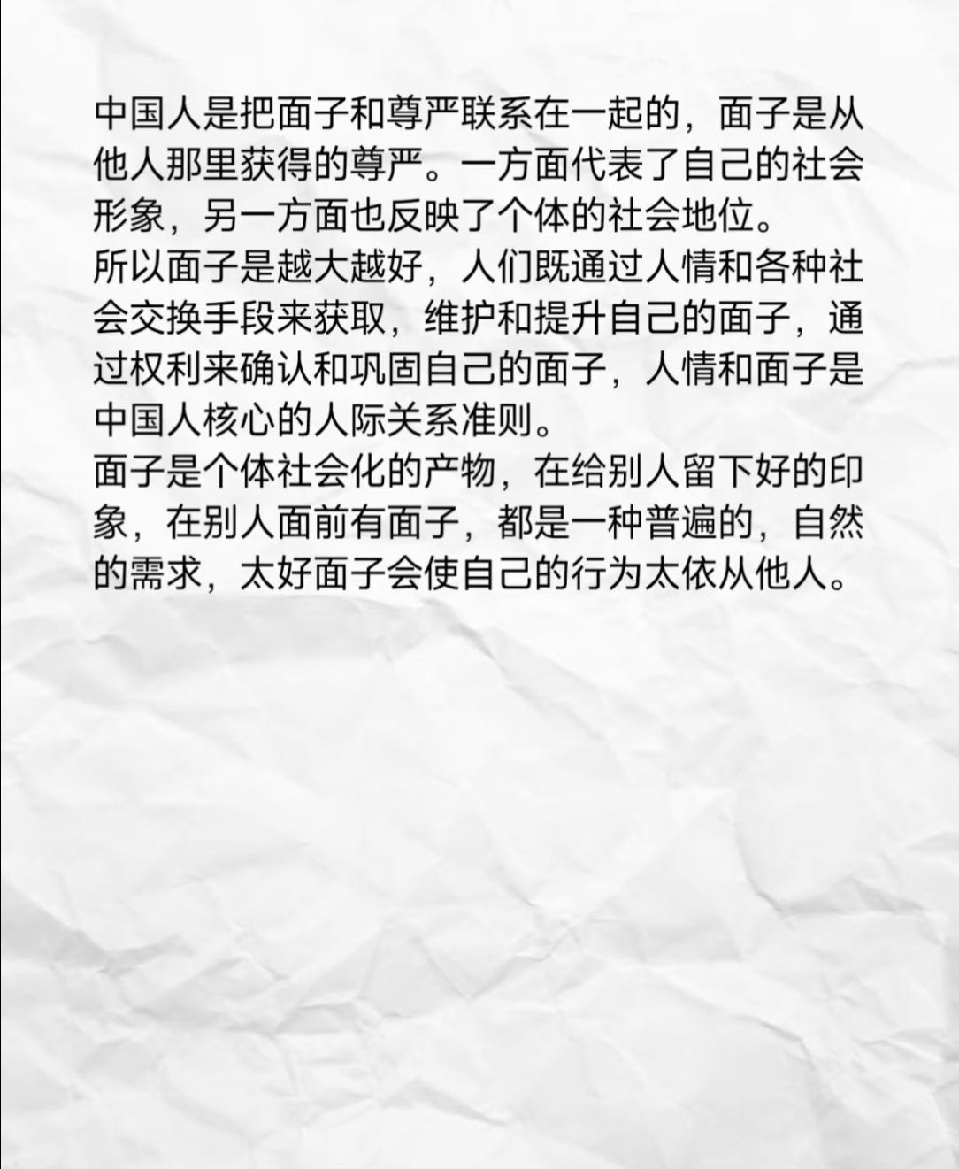 林语堂说过一句很有意思的话:在中国,脸面比其他世俗的财产都宝贵。它比命运和恩惠还有力量,比宪法还受人尊敬。 也就是说它是最具实际价值的“社交货币”。 所以,在与人交往的过程中掌握了这一点就get到了核心。 ------------------------------------- 点个赞+小评一下,愿人生的旅途从容洒脱,不慌不忙; 关注我+收藏一下,愿岁月的长河浅笑安然,细水长流。 万能生活指南