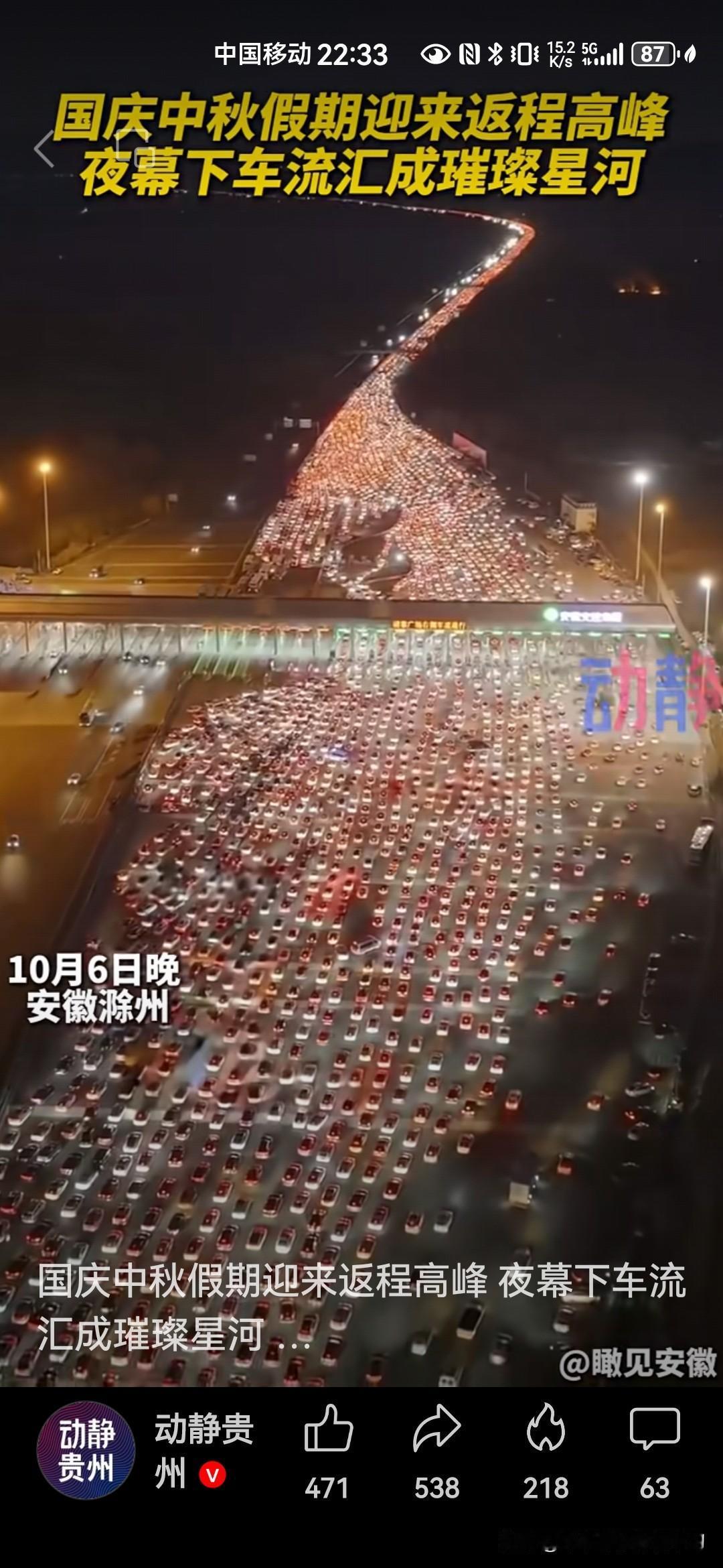 国庆假期结束,高速路上堵成“星河”的景象太震撼了。就拿全国最大的沪陕高速吴庄收费站来说,双向36道闸口,车流配上夜幕下的车灯,那场面让网友直呼“最美星河”。 假期第7日,全国跨区域人员流动量超3亿人次,高速小客车出行量同比增长25.5%,好多路段都堵得水泄不通。不过,车流里也藏着温情,车尾挂着的鸡鸭、后备箱的特产,都是家人的牵挂。而且,还有很多暖心的保障,志愿者帮忙换胎送热水,交通部门精准疏导,新增充电车位。这堵成“星河”的高速路,也是家文化和交通保障能力的体现。