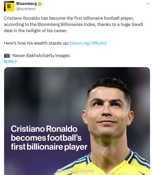 【C罗成为首位十亿资产球员】《彭博社》独家统计:葡萄牙巨星C罗,已经成为足球史上首位“十亿富翁”,在受到沙特联赛和球队的财政加持之下,C罗的个人资产已经达到14亿美元,远远抛离其他足球同行。
