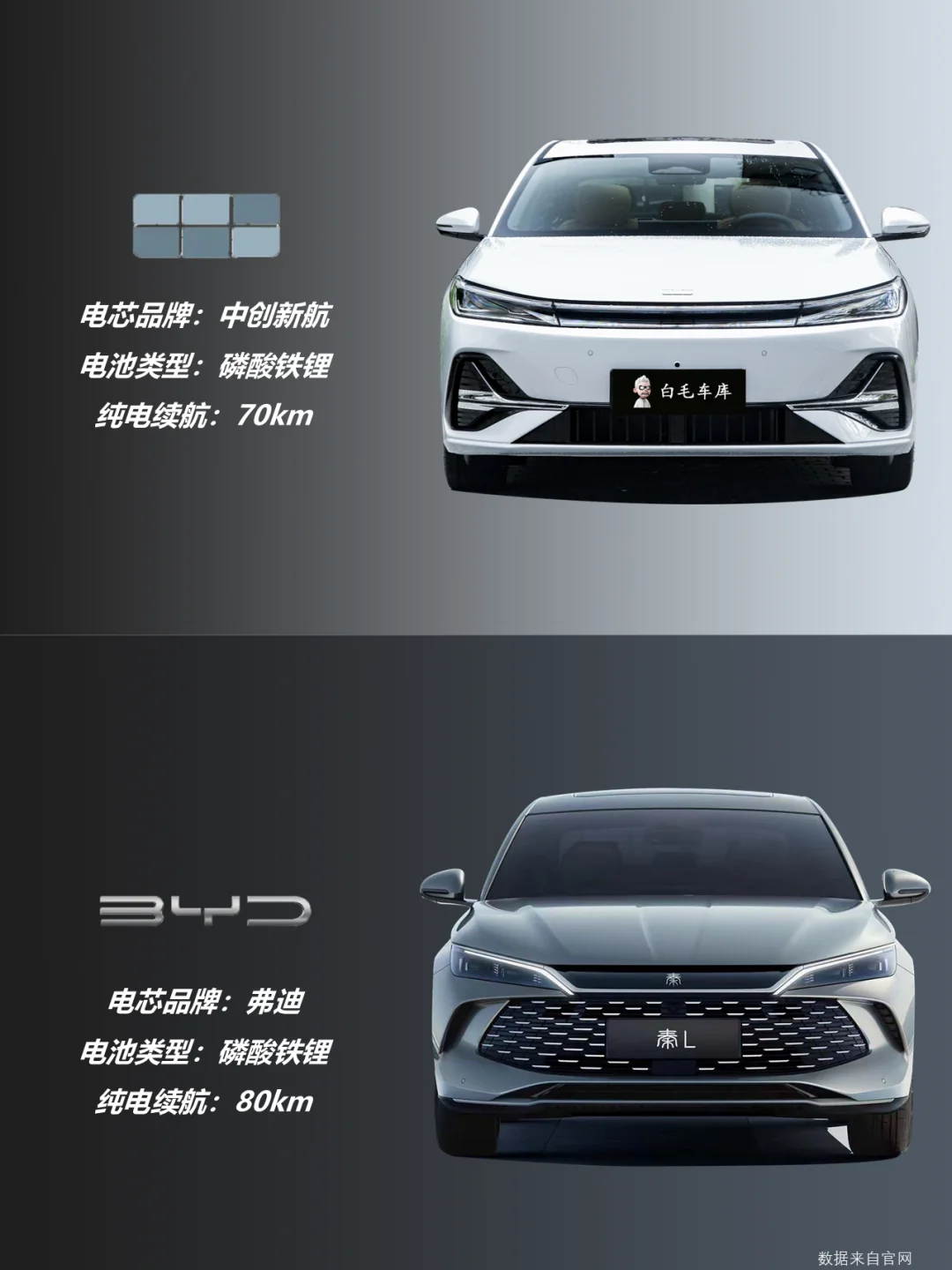 ● 纯电续航:银河A7可选容量为8.5千瓦时和18.4千瓦时的磷酸铁锂电池组,对应的CLTC纯电续航里程为70公里和150公里。秦L DM的CLTC纯电续航里程为80km和120km,两者各有优势。