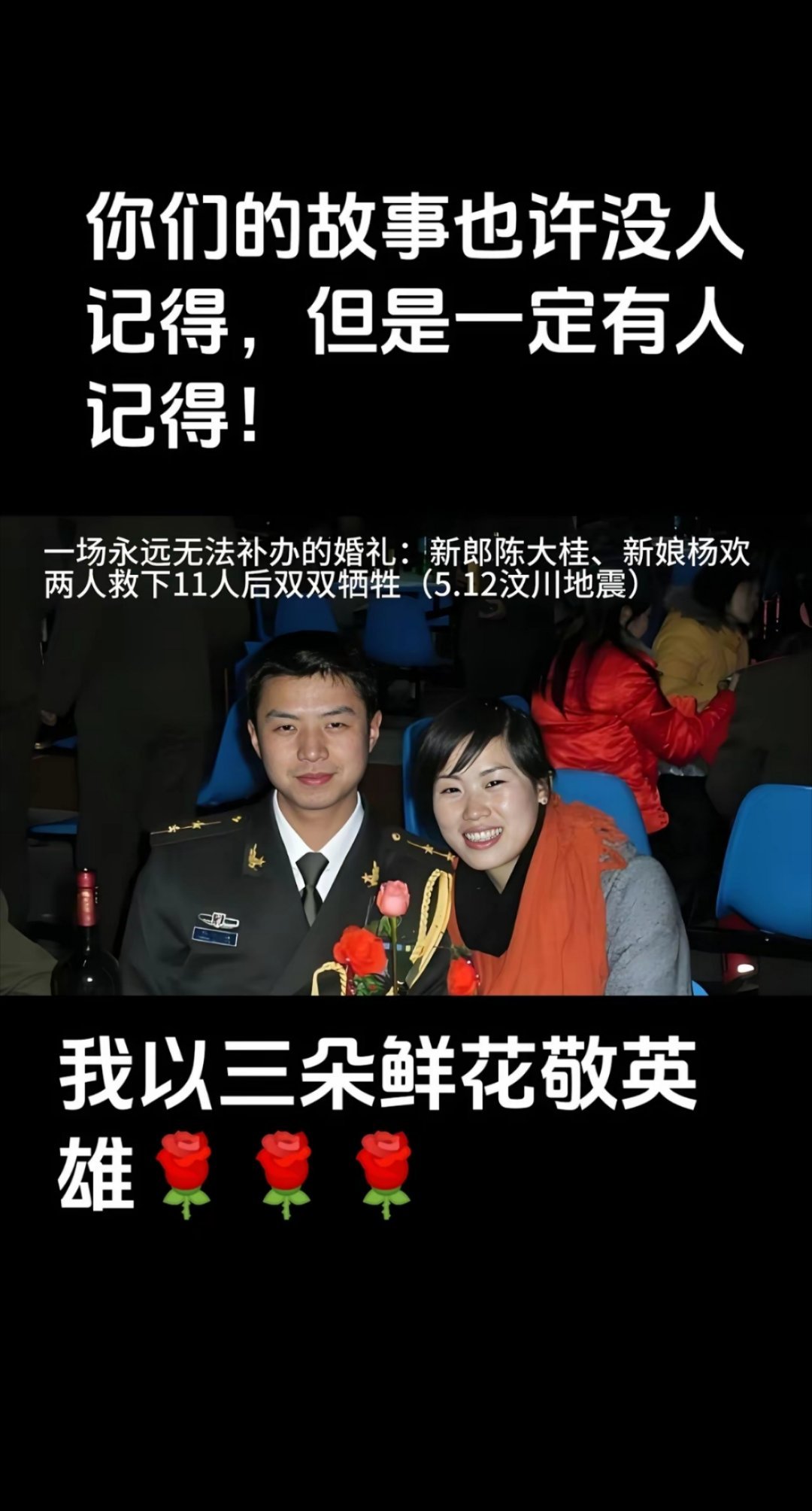 5.12汶川地震英雄陈大桂和妻子杨欢,地震时为救出11名被困群众后双双壮烈牺牲,年仅26岁、25岁!本来准备4天后按当地风俗补办婚宴,却成了一场永远无法补办的婚礼,英雄虽已远去,但是你们的英勇事迹我们永远铭记!致敬英雄