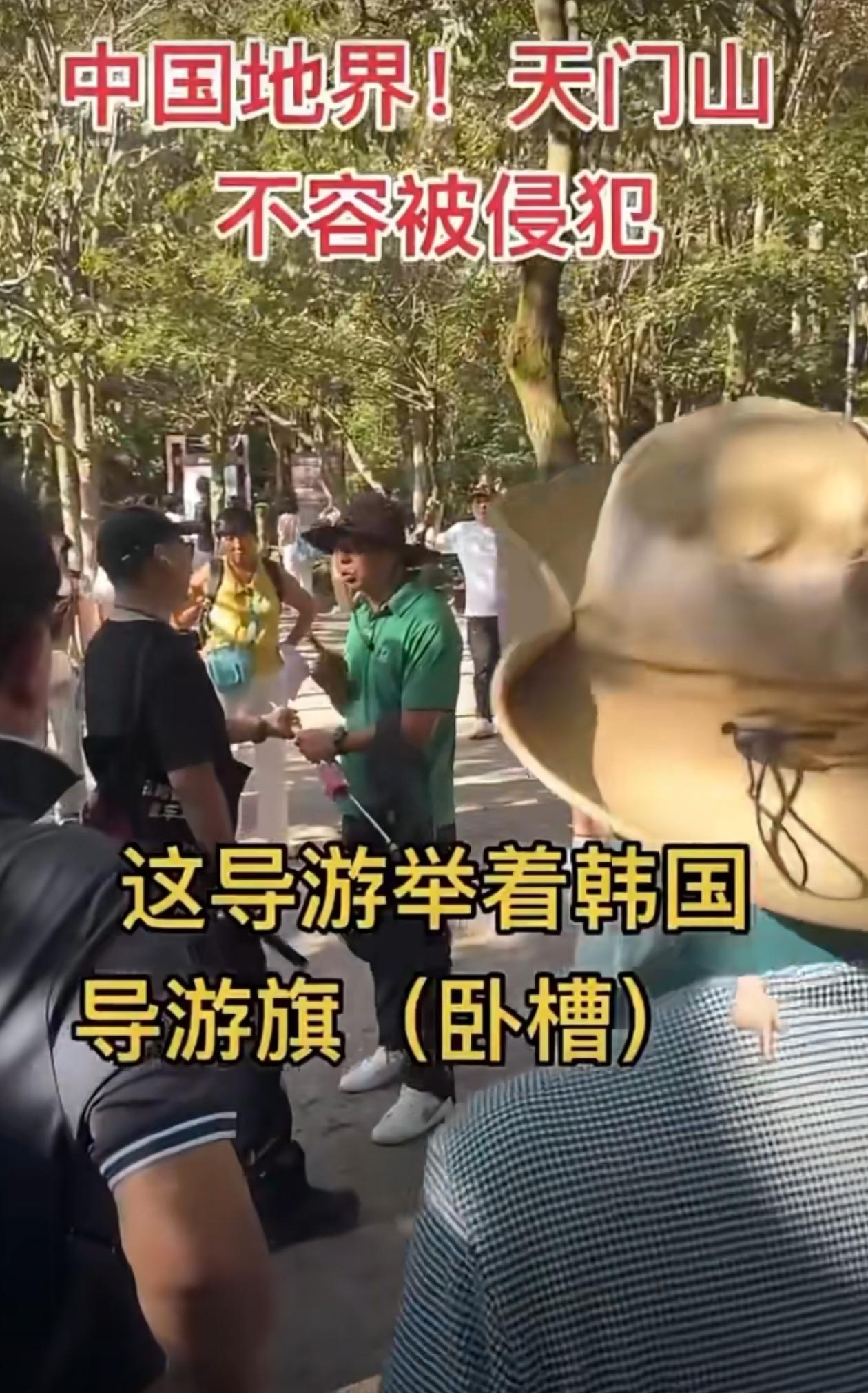 10月7日,湖南张家界。网友发布视频,在天门山景区,一名举韩国导游旗的导游与一名游客发生争执,游客把高度上升到“中国地界不容侵犯”,欲抢夺导游旗并报警…… 韩国似乎很喜欢到张家界旅游,一句话在韩国广为流传“孝顺父母,就带他们到张家界”!