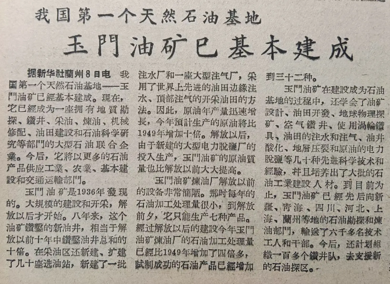 老报上的今天---六十八年前的1957年10月9日《光明日报》报道:我国第一个天然石油基地,玉门油矿已基本建成。