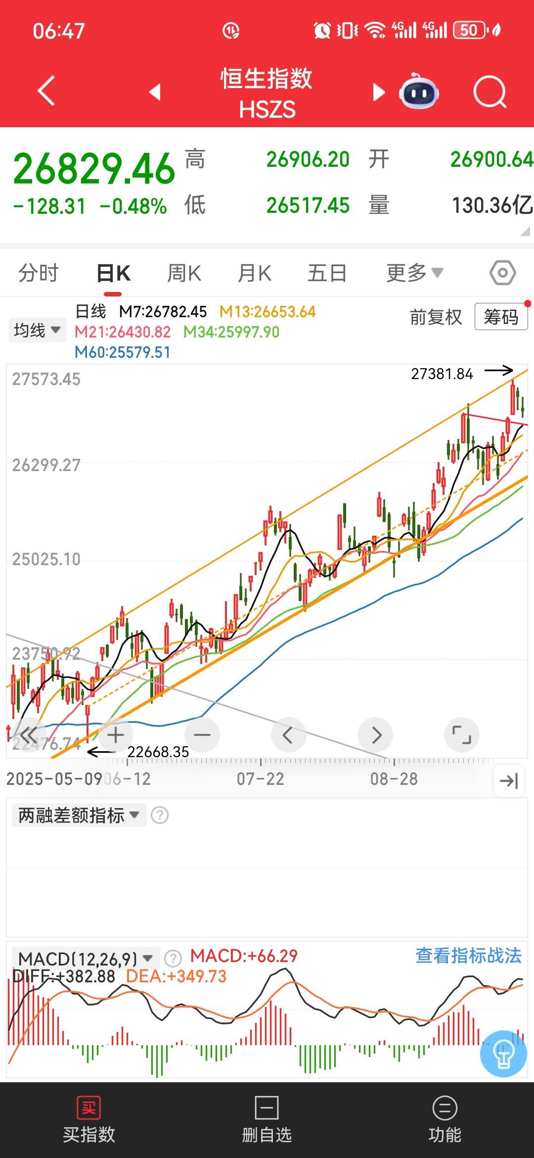 “不以物喜,不以己悲”说国庆后第一天涨跌 A股国庆,港股市场第一天强力拉升,但是后四天回落,直接把拉升的完全跌没了。 为什么这样走,我们看一看港股恒生指数日线走势图就清清楚楚了,事实上港股恒生指数日线走势图上,每一次遇到上面的趋势线就要么在趋势线处或强势震荡或回落,而这一次就是遇到趋势线回落三天。 估计昨晚美国股市二红一绿,今天港股的走势是红盘,A股非常可能也是红盘。 但是我们研究美国股市可以看到,美国股市现在基本上也是在什么的上升趋势线的压力位处遇阻,估计接着的走势是高位震荡或直接回落,在这一个点位是强力突破趋势线的可能性非常之小。那么港股市场应该是震荡回落的可能性非常大,而我们A股在现在的位置要强力拉升的可能性也非常低,我们看深成指就非常明白了。 今年的深成指已经上涨29.88%了,上涨幅度已经不小了,现在又处在非常重要的压力位处,现在的位置要大幅拉升应该是不现实的,那么现在要么高位震荡,要么回落,但是从接着几个月看,回落的可能性应该非常之大。 所以即使今天上涨,也没有必要太高兴——不以物喜吧!但是一二天就来一根大阴线应该还不会到了,所以也没有必要太担心吧! 附美国三大指数、港股恒生指数以及深成指日线走势图