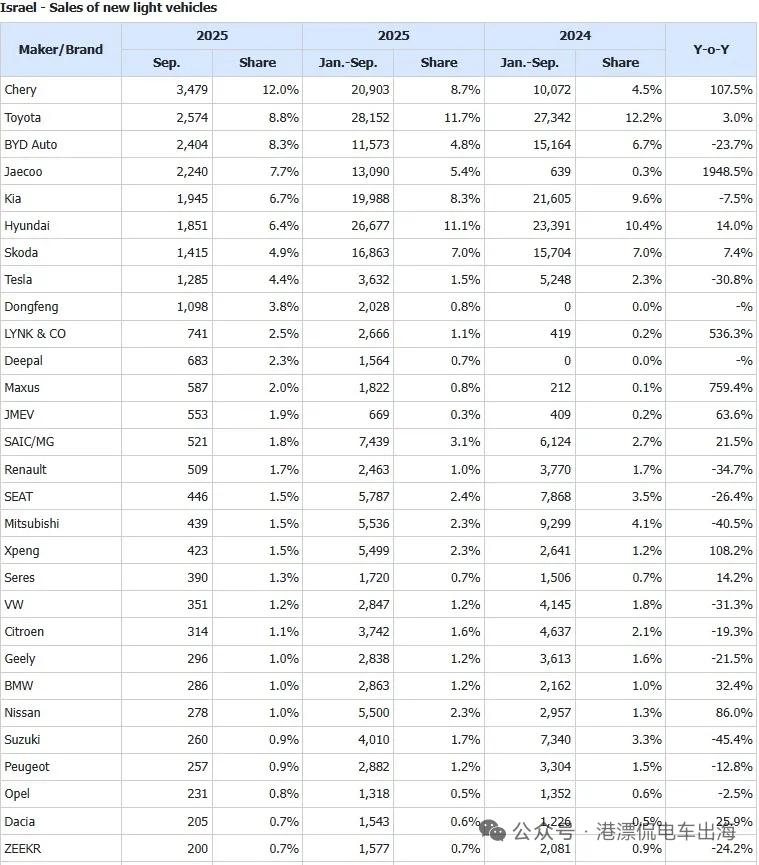 厉害了,战后的以色列疯狂购买中国汽车。不信看看9月份的销量吧,上个月,以色列市场,中国品牌市占率竟然高达45%!这可是半壁江山呐!你能想象吗,中国品牌在以色列市占率快一半了,除了俄罗斯没有第二个海外市场有这样的成绩。这可是以色列,是美国的共生体啊。 各个中国品牌百花齐放,其中第一名的奇瑞市占率高达20%,把丰田跟现代起亚吊着打。然后比亚迪市占率百分之8.2,仅次于丰田。然后东风也有百分之4.8,吉利也有百分之4.8。上汽旗下的,名爵跟大通加起来也有3.8%。小鹏领跑未来,也有一些份额。这简直就是中国市场的翻版,谁敢相信这是在以色列市场?