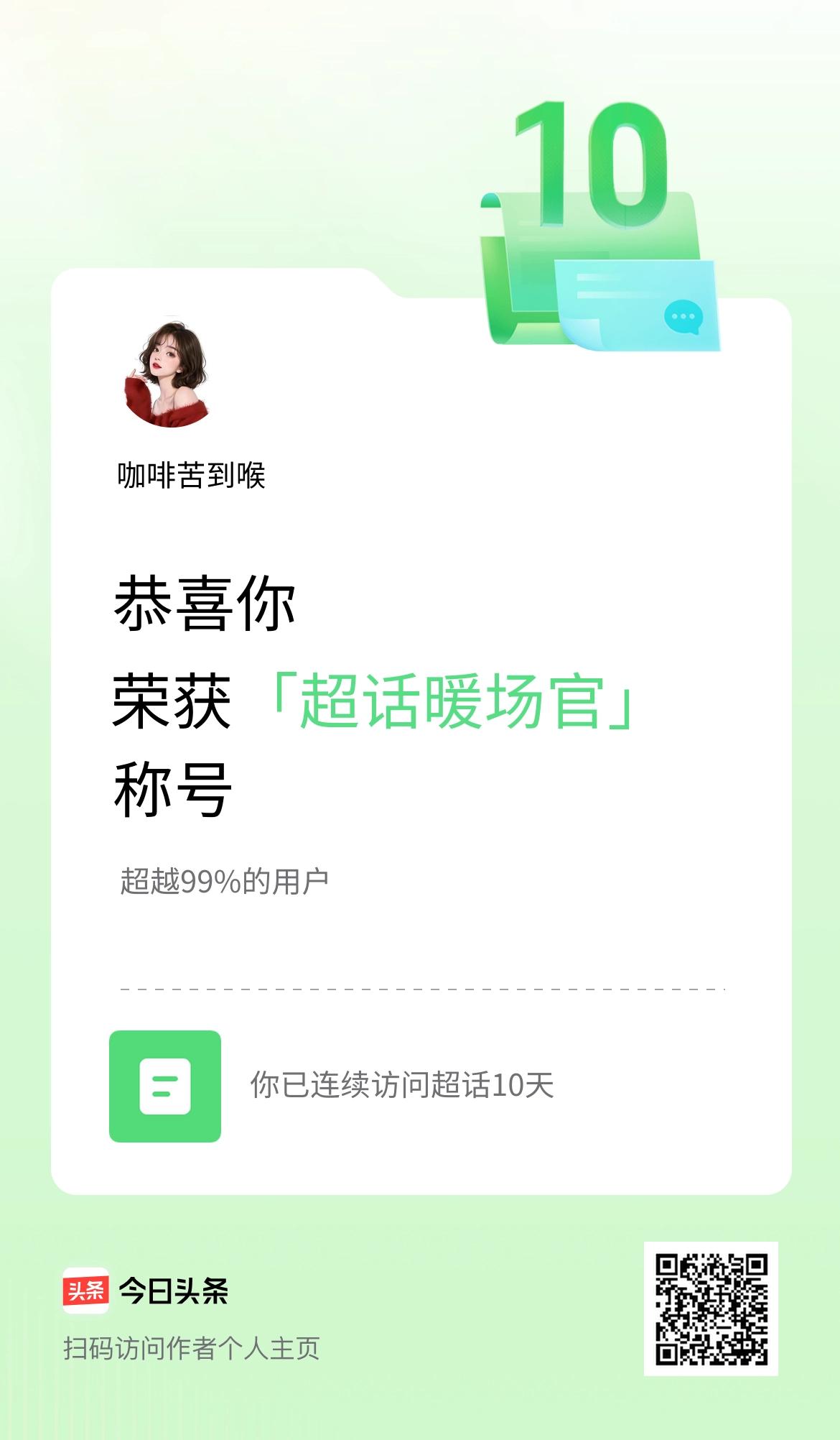 我在头条连续访问超话10天,获得“超话暖场官“称号,你也快来超话看看吧~