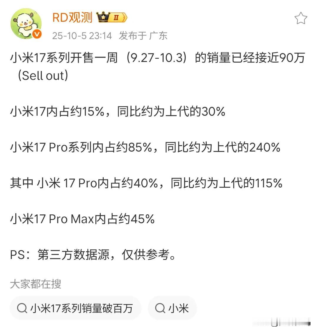 小米17系列销量破百万,雷军的目的达到了。。。 说实话,小米17Pro系列加一个背屏后销量会比之前的Pro销量好这一点我是有心理准备的,但是这次小米17Pro和小米17ProMax销量大大超过小米17(反过来显得:Pro貌似才是标准版,小米17好像成为了青春版)这一点我是有点意外的。 当年小米11Ultra也带了一个副屏,销量也不咋滴呀,怎么小米17Pro和小米17ProMax这次换了一个大一点的副屏销量就起来了???之前努比亚和vivo NEX双屏版背部还是一整块大屏也没火呀,小米17Pro系列这就火了让我很费解。 不过从改名到小米17,然后和iPhone17Pro系列背部设计的撞脸,这一切做法都是为了“对标iPhone”,而对标iPhone的结果就是越像卖得越好,当年的小米8跟iPhoneX不就是例子么?但不管怎么说,雷军的目的达到了。 但我有点没明白,这个背屏不就是小折叠那个设计么,也不是第一次了,为啥就踩中了???(发现小米17Pro系列这次女性用户很cute)。 另外,今年小米17Pro系列借着背屏火了一把,那后续机型是不是都要延续这个设计,如果继续带着背屏,那小米后续的设计也基本被绑死了(你总不能用居中镜头模组吧,不然这背屏被分割得四分五裂,就只能延续这种1字型的设计了,又或者像iPhone17Air那种横向一字型,这样才能尽可能多的把屏幕区域露出来)。