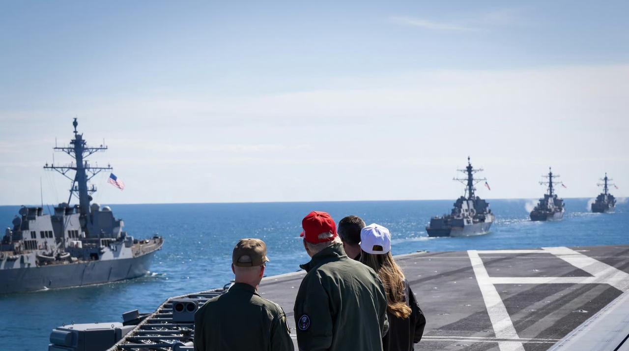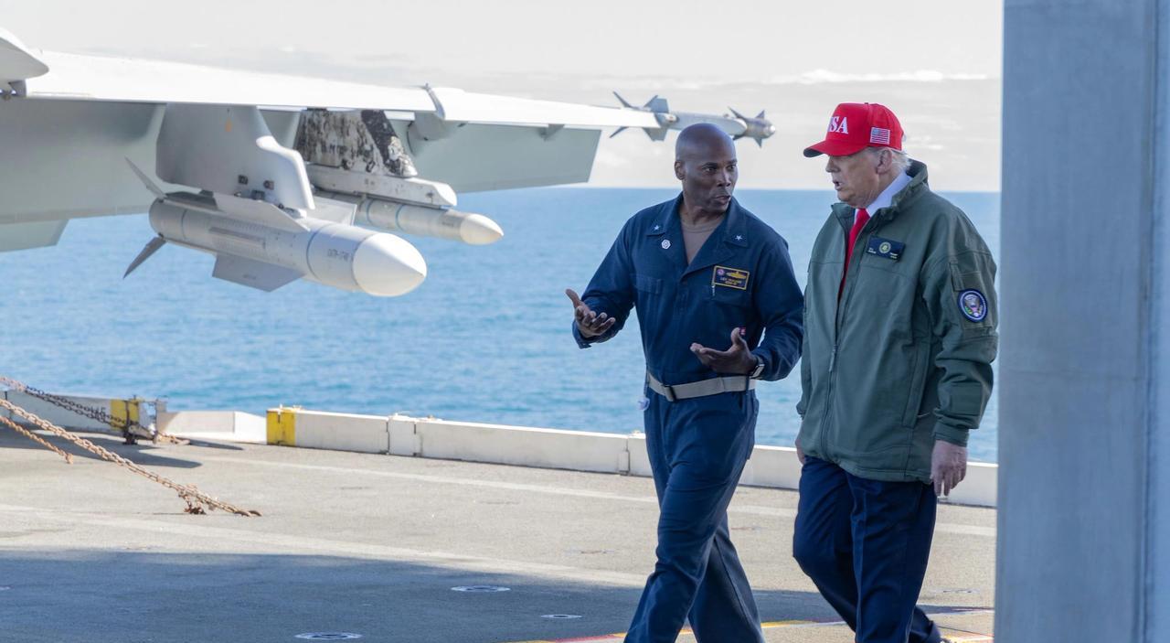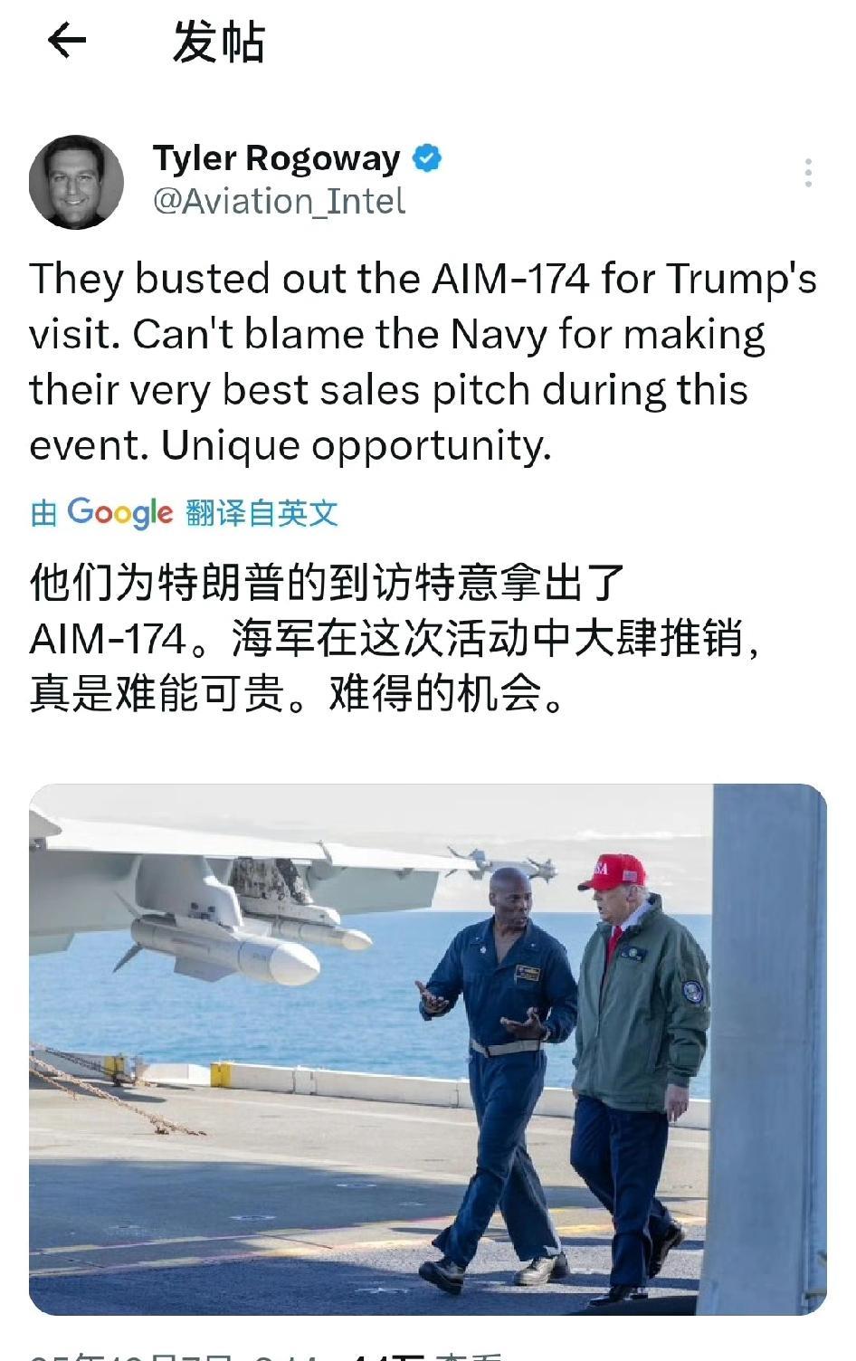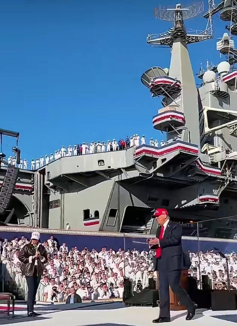 美国又破防了!特朗普上航母看飞机,这时候特意跑去看,无非就是针对咱们人民海军"福建"舰起降三种舰载机,并且"福建舰"是人类首次在海上用电磁弹射器、电磁拦阻索起降第5代舰载歼击机。 2025年10月5日,特朗普前往圣地亚哥,美国海军“乔治·H·W·布什”号航母(CVN-77),和“杜鲁门号”航母(CVN-75)接受其检阅。 美军先发射了至少5枚标准-2型防空导弹,耗费1000多万美元,作为迎宾礼花……之后特朗普在航母"布什"舰上,观看第5代战斗机F-35C降落。这次有几个看点,一是美国海军特意展示已经装备的AIM-174型中远程空空导弹,这是针对我军的霹雳-15,但晚了将近10年……二是“杜鲁门号”号航母8个月还未修好,破损处在活动中用一个海报板进行遮掩,堪称腐朽至极的例证——2025年2月12日,该舰部署中东作战期间,在地中海埃及塞得港附近与土耳其商船“贝西克塔斯-M”号相撞,船尾右舷浮筒区域出现多处裂口, 特朗普称,此次活动是“美国海军实力重要展示”,并强调“美国正在建造的军舰数量,超过历史任何时期”。后面这句是不折不扣的谎话,实际上整个冷战期间,美国造舰规模和速度,都远超现在,就不用说二战期间了。其实目前美国海军装备和舰艇建造,都处在100年以来的低谷,而且还在下滑! 特朗普又声称,"任何敌人都需在和平共处与完全毁灭间,进行选择","美国航母、驱逐舰的全球存在,将迫使对手屈服"。实际上,目前美国威胁主要对手的能力,完全依靠核力量——战略核潜艇、洲际导弹和轰炸机,还就是没有"航母和驱逐舰"什么事。