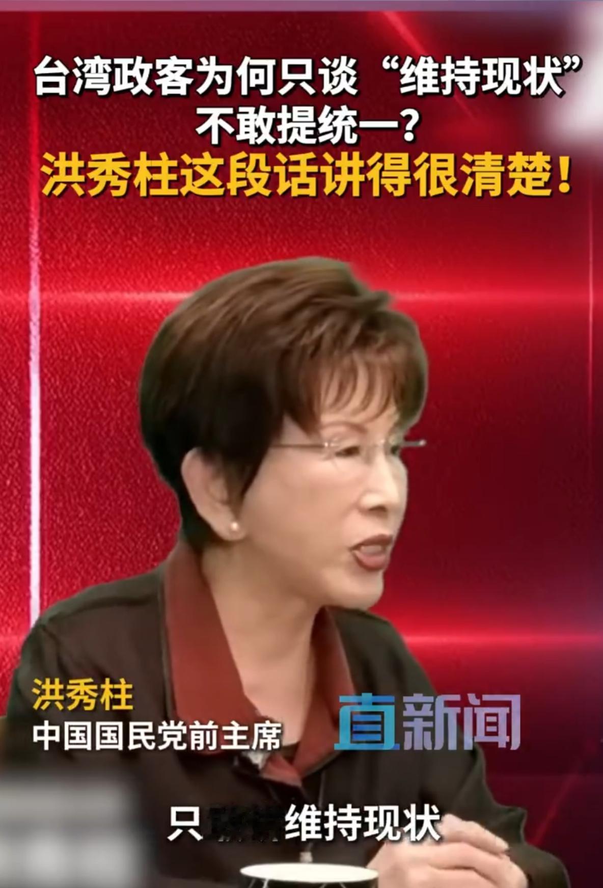 前国民党主席,洪秀柱女士出来表态了! 台湾政客为何只谈“维持现状”,不敢提统