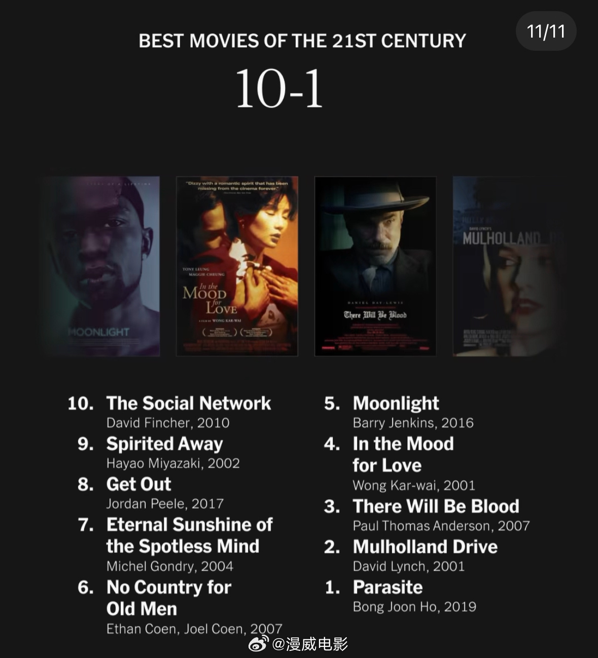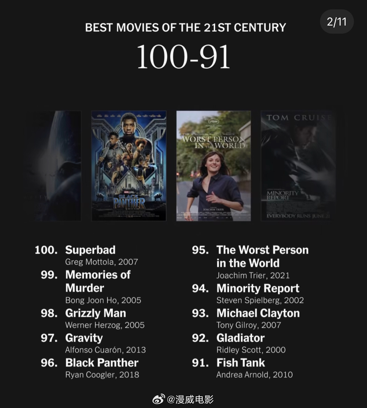 在21世纪最好的100部电影里,有一部漫威电影入围。 来自好莱坞及世界各地的500多位有影响力的导演、演员及其他知名人士,评选出了自2000年1月1日以来世界各地上映过的最佳电影。 于2018年上映的《黑豹》是唯一上榜的漫威电影,排在第96位。✅ DC于2008年推出的《蝙蝠侠:黑暗骑士》位列第28位。 位列榜单前五位的分别是: 1、2019年《寄生虫》 2、2001年《穆赫兰道》 3、2007年《血色将至》 4、2001年《花样年华》 5、2016年《月光男孩》