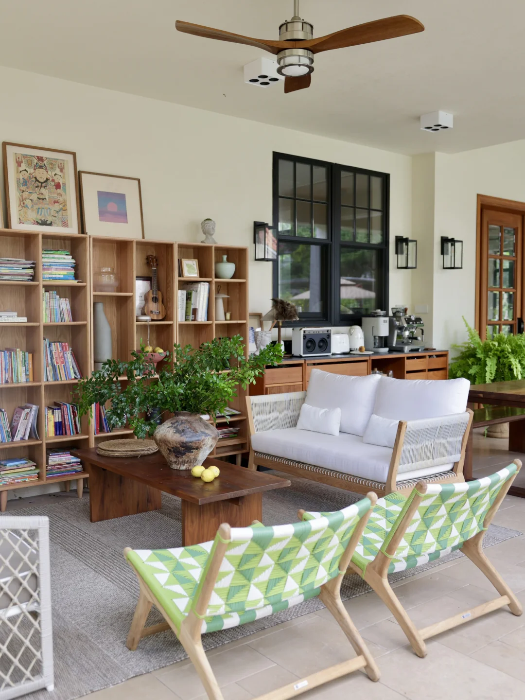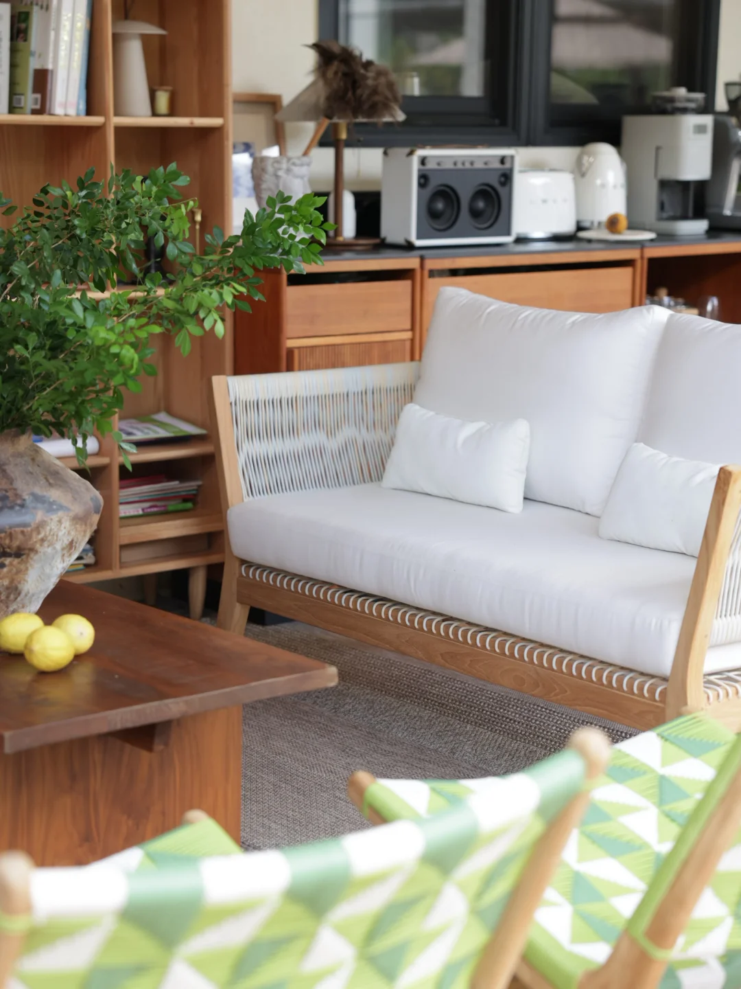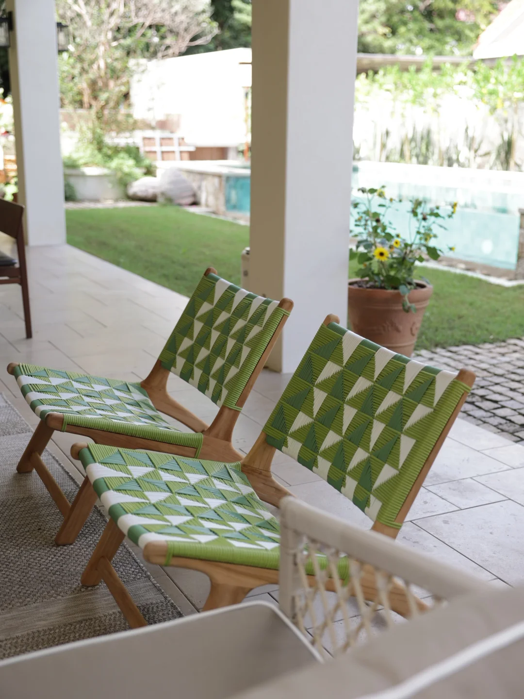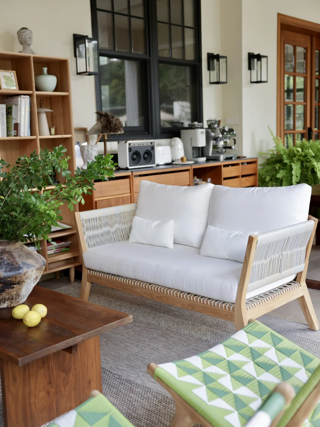 绿色的藤编休闲椅是柚木的,稍微飘点雨进来也不用担心,它的颜色让整个空间显得明媚灵动