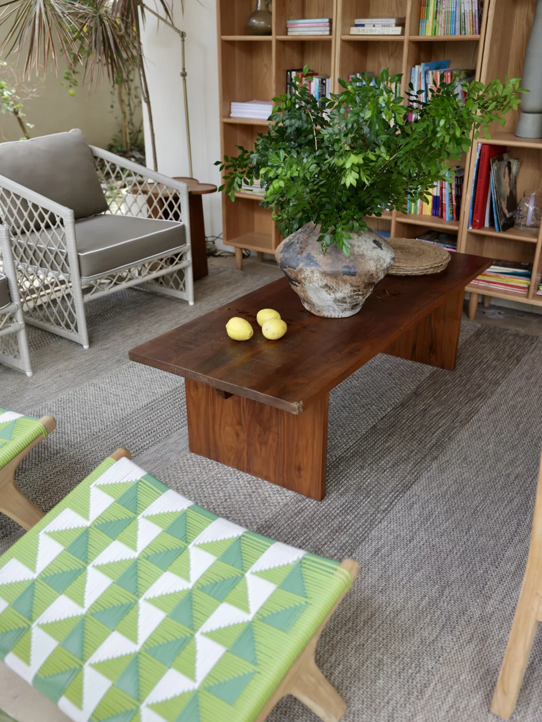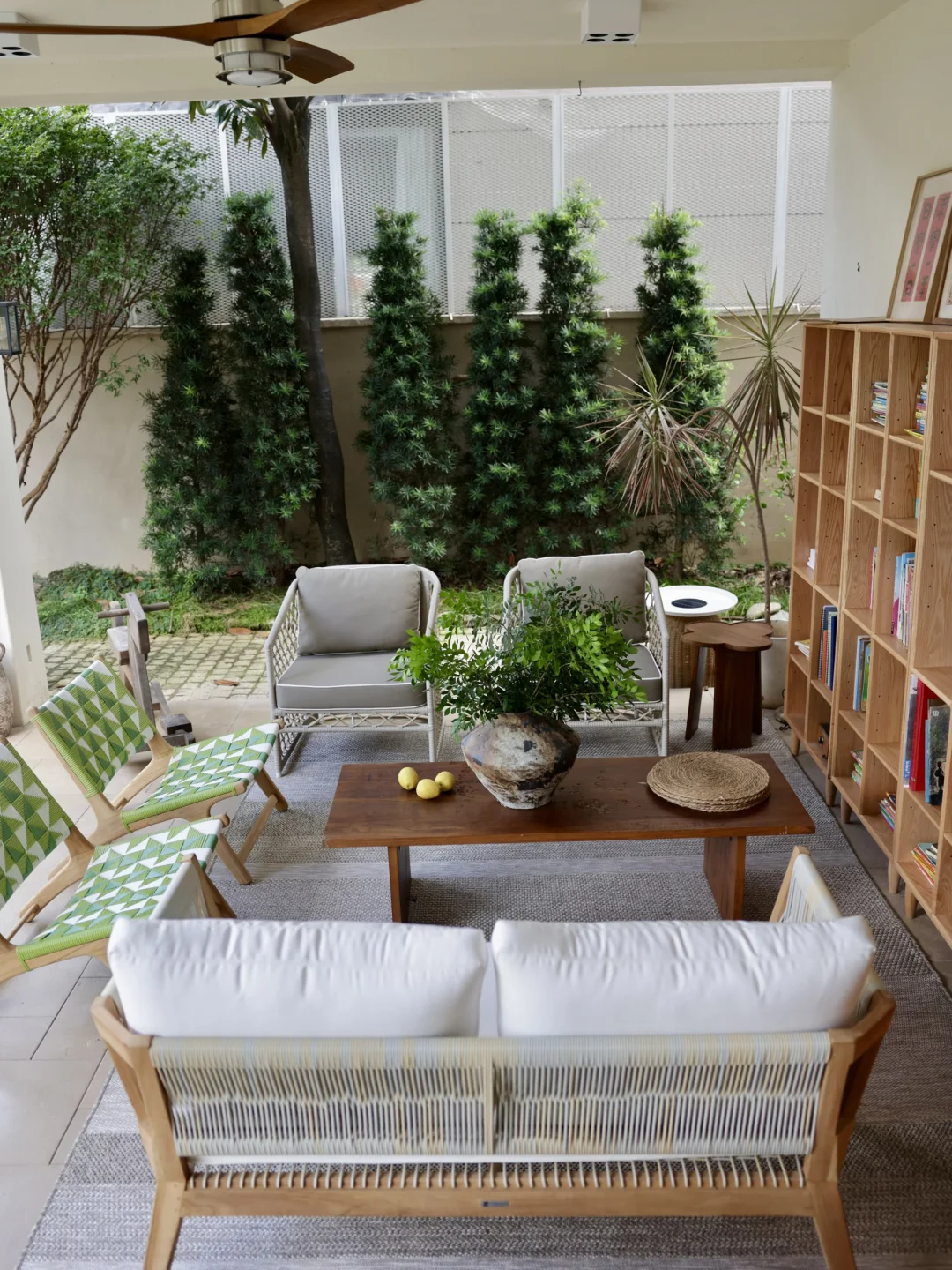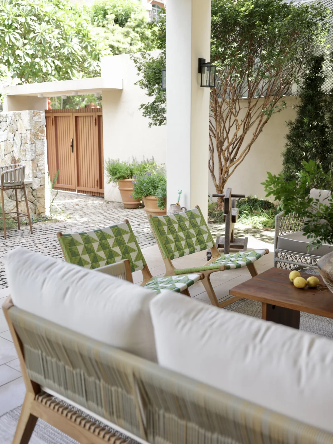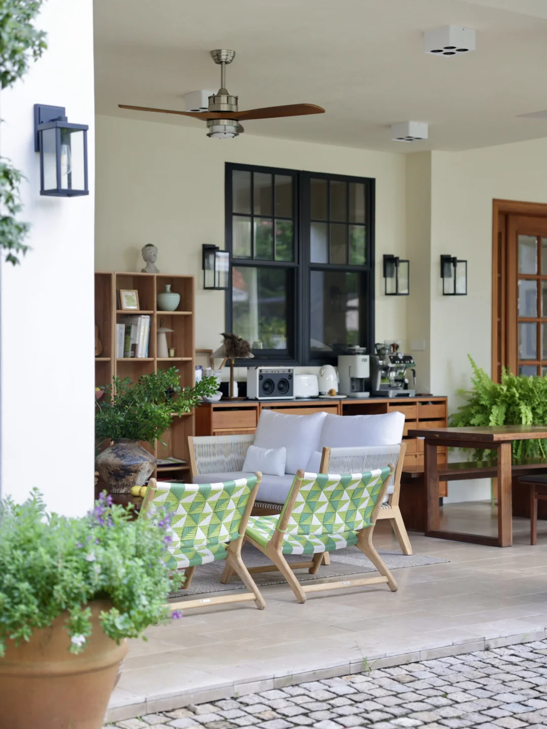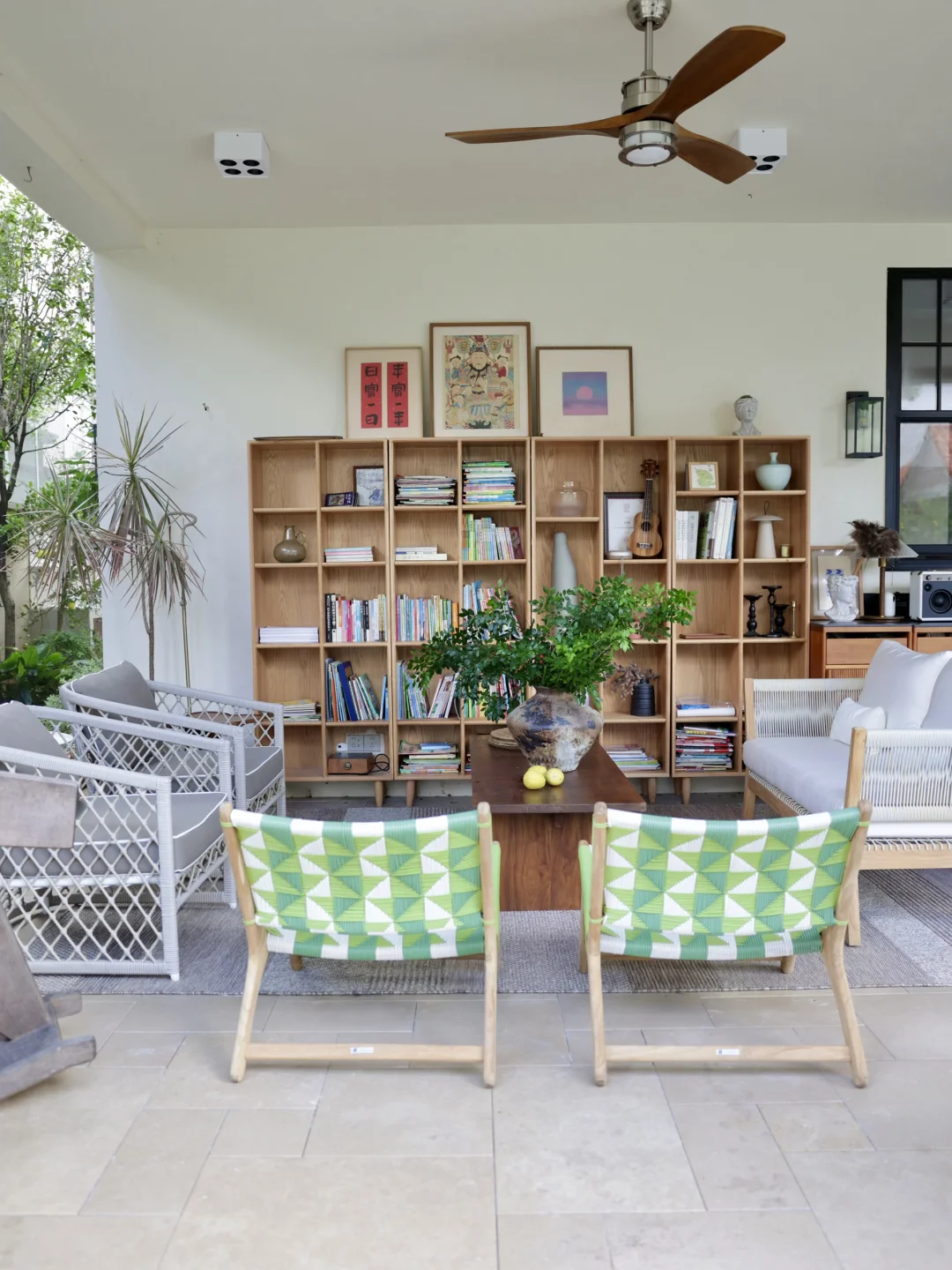 绿色的藤编休闲椅是柚木的,稍微飘点雨进来也不用担心,它的颜色让整个空间显得明媚灵动