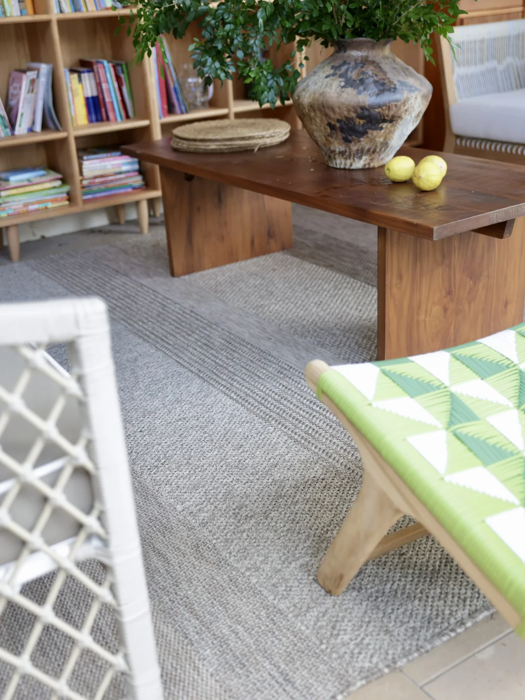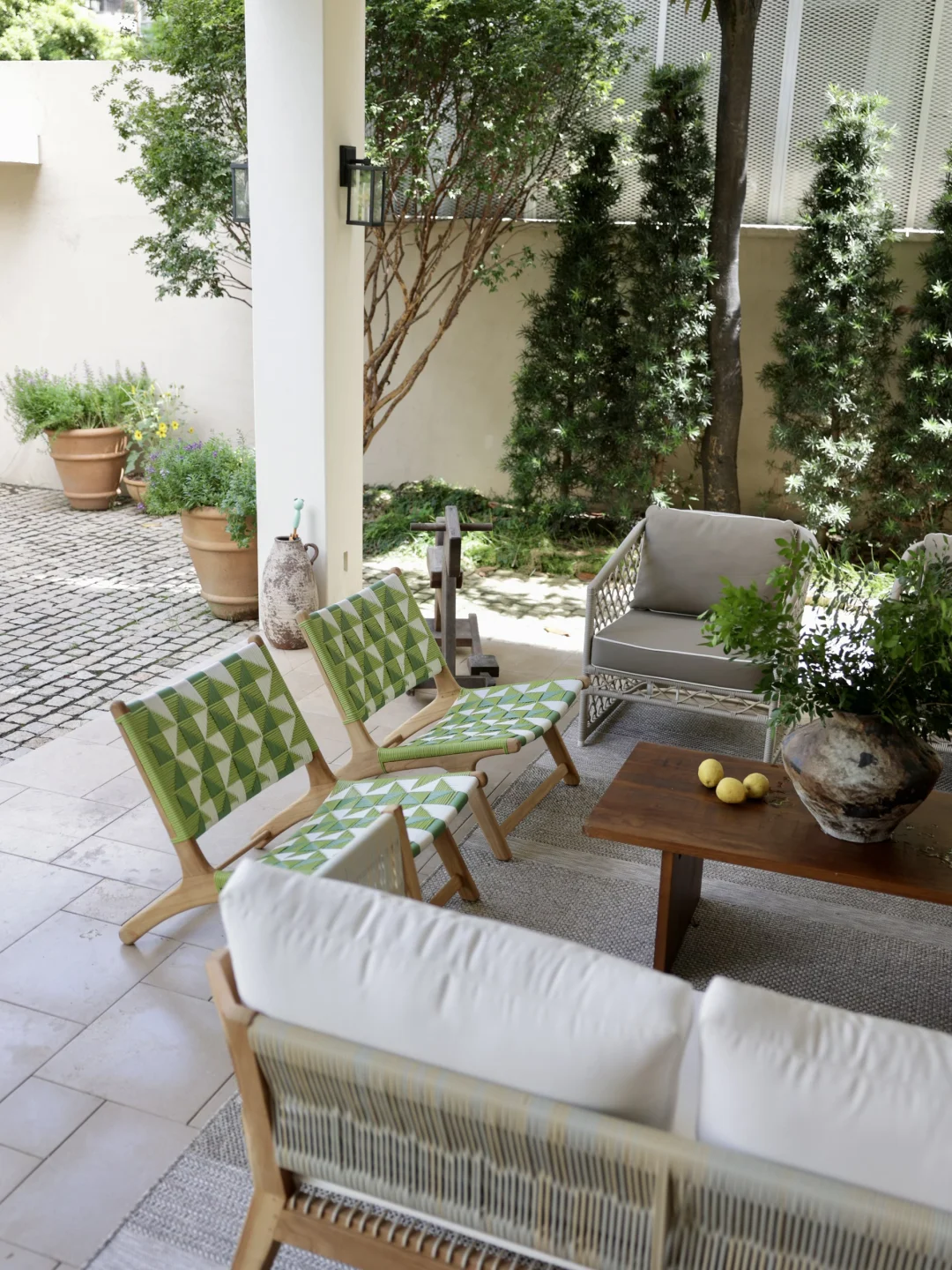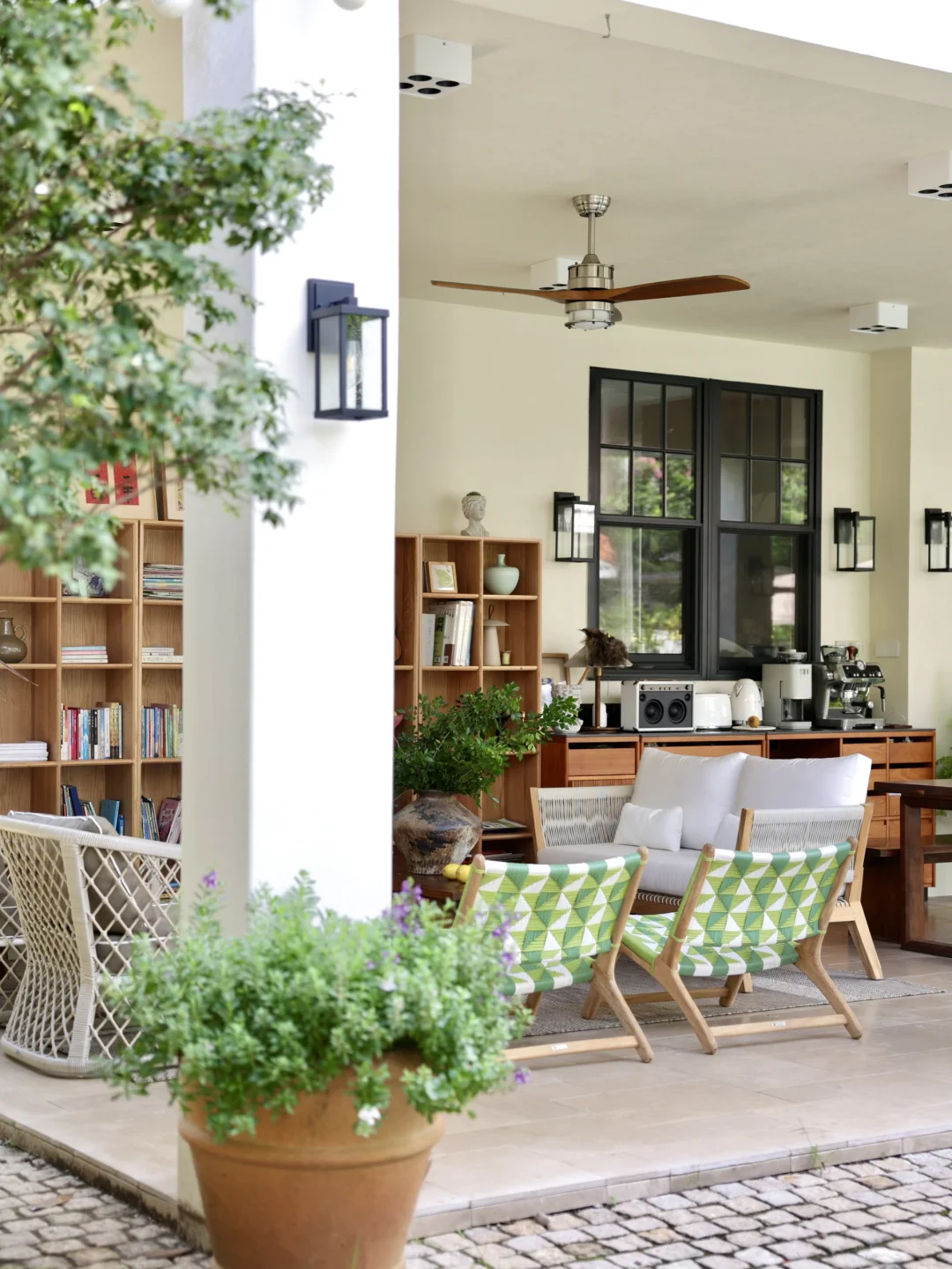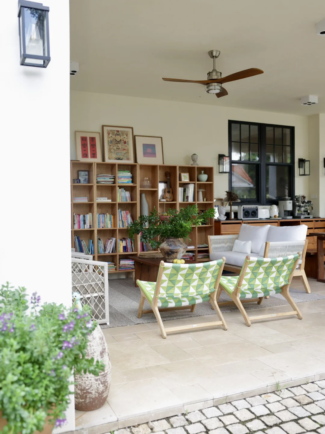绿色的藤编休闲椅是柚木的,稍微飘点雨进来也不用担心,它的颜色让整个空间显得明媚灵动