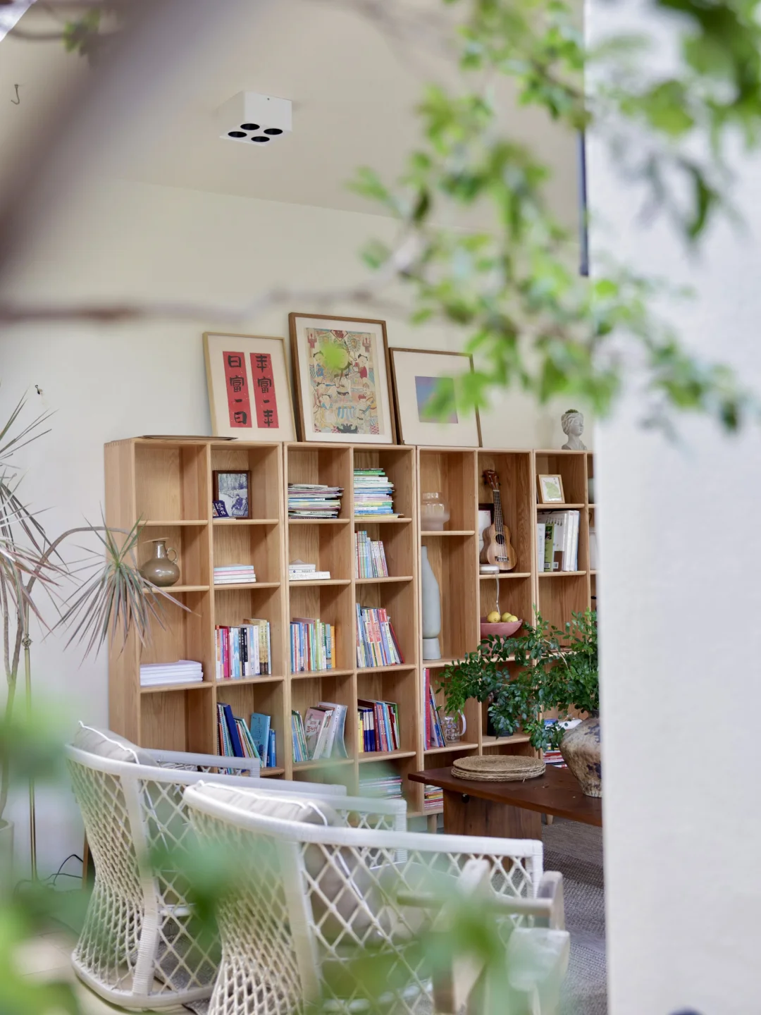 我把廊台的三分之一空间布置成了一个阅读角,放了一排橡木书柜(原木不像板材容易受潮变形)铺了户外地毯,椅子也换成了更方便阅读的小型沙发(都是户外产品)茶几是老房子搬过来的(黑胡桃原木,也不怕变形)