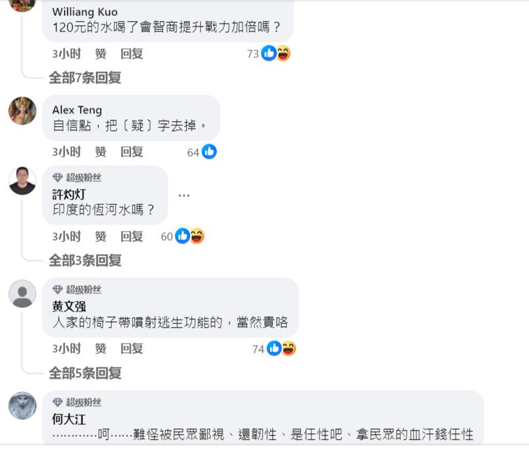 继续掏空台湾..... 台媒今日报道:台湾5700亿元的“强化韧性特别预算”中,台独“伪防部”预算就高达1132亿余元,而“伪防部”联合作战中心竟购买每张5万元的长官座椅,一瓶的500cc瓶装水为120元。 蛙军解释:参考日本市场进口价 我突然想起美军的一袋螺丝要9万刀。[捂脸]