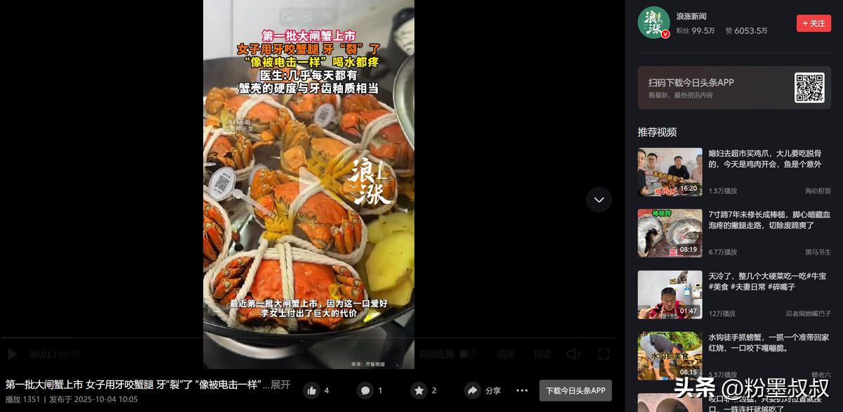 “悲剧还是发生了!”近日,浙江杭州,一女子在家吃螃蟹,她用牙齿咬开螃蟹腿时,突然感到一阵剧痛,随后竟然连喝水都疼!女子疼得受不了了,就去医院检查,结果发现牙被蟹腿崩“裂”了,需要进行根管治疗。网友:螃蟹壳这么硬? 那天李女士下班回家,特意从冰箱里拿出前一天买的大闸蟹,蒸好后端上桌,还配了醋和姜丝,就等着好好解馋,吃蟹的时候她嫌用蟹钳夹蟹腿麻烦,往常也总这么干,就直接拿起一只蟹腿,凑到嘴边用牙齿去咬,想把壳咬开把里面的嫩肉抠出来。 结果刚用劲就听见嘴里 “咔” 的一声轻响,紧接着一阵钻心的疼猛地窜上来,瞬间就蔓延到了半边脸,跟触电似的,李女士疼得 “嘶” 了一声,赶紧把蟹腿扔了,用手捂着腮帮子,好一会儿都没缓过劲来,一开始她还以为是咬太用劲,牙酸了歇会儿就好,可没过多久连喝口温水都疼,水刚碰到那颗牙,就像有根针在扎牙龈,疼得她直咧嘴,连饭都没法吃了。 到了晚上疼痛不仅没减轻,反而更厉害了,甚至连说话都得小心翼翼,生怕牵动那颗疼牙,李女士实在扛不住了,第二天一早就赶紧去了医院口腔科,心里还琢磨着:“不就是咬个蟹腿吗?怎么能疼成这样?” 医生用口腔镜和小探针仔细检查了半天,终于找到了问题,李女士那颗咬蟹腿的牙,裂了一道缝!那缝特别细,肉眼几乎看不见,可已经从牙齿表面一直裂到了里面的牙神经,医生说,这叫 “牙齿隐裂”,而且因为裂得太深,牙髓都受了伤必须做根管治疗才能好。 李女士一听就懵了,她之前听人说过根管治疗,又费时间又遭罪,得跑好几趟医院,先把牙齿里坏死的神经清干净,再填充修复最后可能还得套个牙冠,更关键的是医生说就算治好了,这颗牙也回不到以前的健康状态,以后不能再咬硬东西了。 这事儿后来被李女士的朋友发到网上,不少网友都惊了,纷纷留言:“螃蟹壳这么硬吗?咬个蟹腿都能把牙崩裂?” 还有人说自己也总用牙咬蟹壳,现在想想都后怕。 其实医生早就见怪不怪了,还跟李女士说每年大闸蟹上市的季节,口腔科都会来好几个这样的病人,都是因为用牙咬蟹壳、蟹腿导致牙齿隐裂的。 医生解释说别看螃蟹壳摸起来不算特别厚,可它的硬度跟我们牙齿最外层的牙釉质差不多,用牙咬蟹腿,根本不是 “牙啃壳”,而是硬碰硬,时间长了或者劲儿用大了,牙齿就容易裂。 李女士这才明白,原来自己一直觉得 “牙口好,咬点硬的没事”,是个大误区,她平时还总用牙开啤酒瓶盖、咬核桃壳,现在想想那些行为其实都在给牙齿 “埋雷”,医生还说尤其是中老年人,随着年龄增长,牙齿会慢慢变脆,更容易出现隐裂,更得注意别用牙咬硬东西。 李女士现在后悔得不行,早知道当初麻烦点,用蟹钳或者小剪刀把蟹腿壳剪开,也不至于落到要做根管治疗的地步,本来挺开心的一顿蟹宴,最后闹得又疼又费钱,还得遭罪真是得不偿失。 (信息来源:浪张新闻)