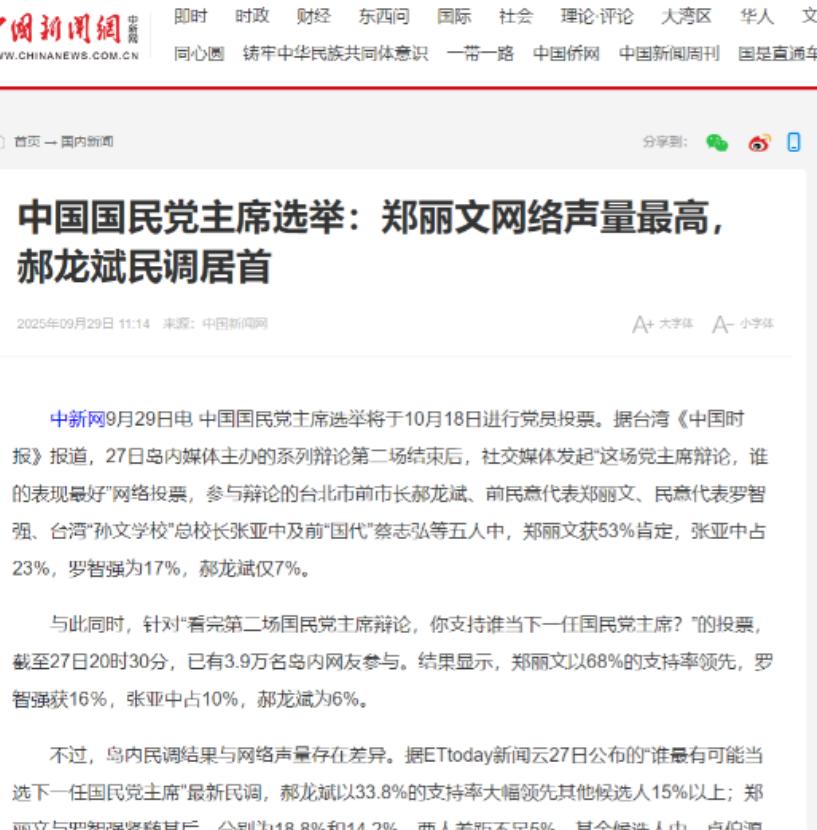 国民党主席选举结果出现!郑丽文民调以68%位居第一,郝龙斌则仅仅获得6%,处于垫
