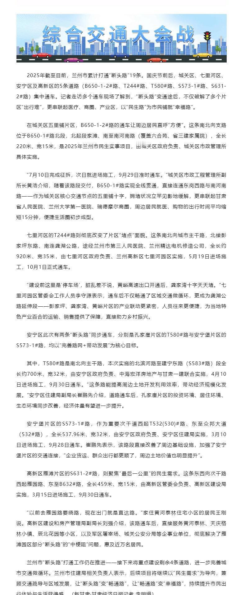 织密城市交通网——兰州5条“断头路”集中通车】2025年截至目前,兰州市累计打通“断头路”19条。国庆节前后,城关区、七里河区、安宁区及高新区的5条道路(B650-1-2