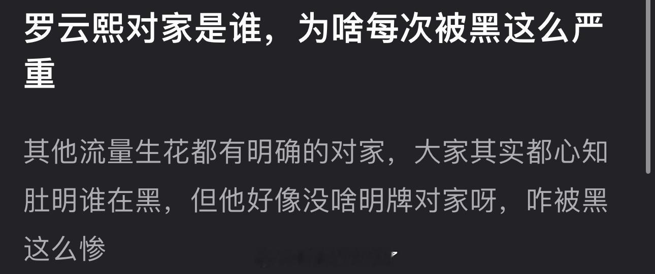 罗云熙对家是谁?为啥每次被嘿这么严重?其他流量生花都有明确的对家,大家其实都心知肚明谁在嘿,但他好像没啥明牌对家,怎么被嘿这么惨
