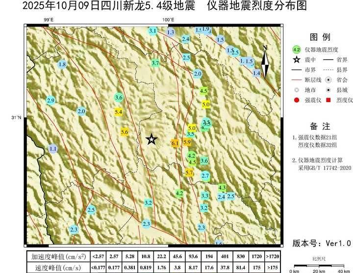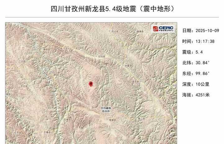 四川甘孜新龙附近 10 月 9 日发生 5.4 级地震,哪些地方有震感?当地情况怎么样? 中国地震台网正式测定:10月09日13时17分在四川甘孜州新龙县(北纬30.84度,东经99.86度)发生5.4级地震,震源深度10千米。 ------------------------------------ 这次地震打破了自今年6月5日云南大理洱源M5.0以来的持续4个月多的川滇5级地震平静,打破了自去年5月27日四川木里M5.0以来的四川持续一年四个多月的5级地震平静。 此次地震最靠近乡镇为友谊乡,人口约1550人,地震造成新龙,白玉,理塘,甘孜部分地区有感,整体有感范围不大。 地震最大仪器烈度出现在通宵镇,6.1度,预估最大烈度7度左右,初步判断不会造成明显的破坏性影响。 这次地震附近的活动构造有赠科-硕曲断裂带和甘孜-理塘断裂带,更靠近前者。 震中在红色五角星北部震源机制解为正断层型地震,发震构造为EW走向,根据区域构造分析,此次地震为赠科-硕曲断裂带中的EW拉张阶区(拉分构造)发生活动导致。 因此此次地震不属于大型活动构造的地震,属于区域小构造的活动。 但是其周边大型断裂带的地震风险仍然存在: 周边的理塘断裂带,金沙江断裂带和巴塘断裂带是青藏高原向东逃逸和旋转的关键调节边界之一。受印度板块与欧亚板块持续碰撞的远程效应影响,整个青藏高原物质向东和东南方向移动,该区域吸收了大量的地壳应变。 在历史上发生过1870年巴塘地震,震级7.25级, 1890年甘孜地震:震级约7级,1948年理塘地震:震级7.3级等等。 近年来白玉,巴塘等地的小震不断仍然表明了此处具有较为明显的地震风险性。