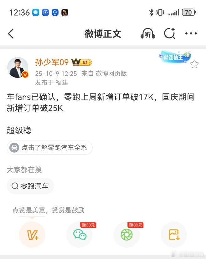零跑上周新增订单破17000单,国庆假期继续爆单 25000单,十一期间销量同比涨了62%,再创新高。