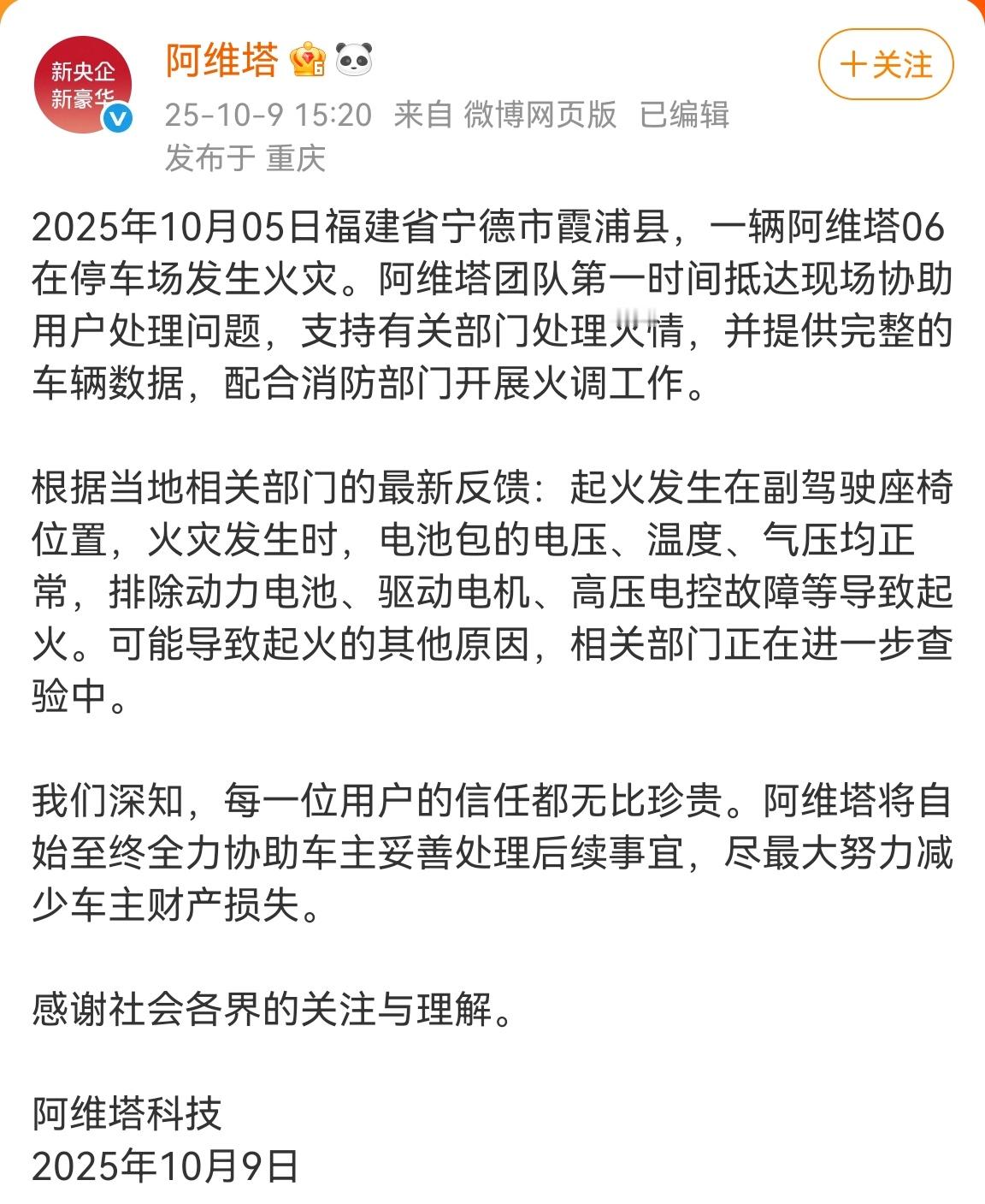 官方回应阿维塔火与电池无关官方回应已出,明确排除电池因素。这说明车辆安全需综合研