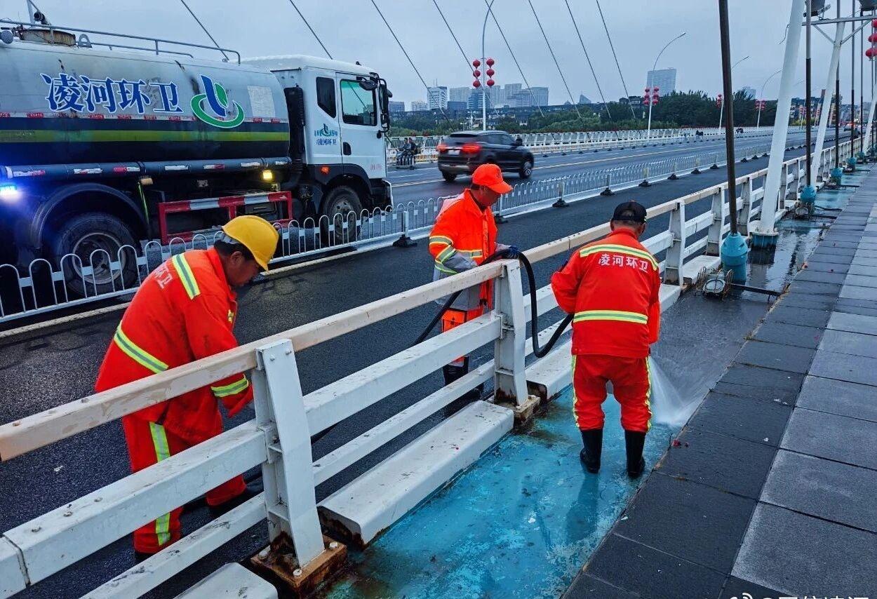 精细化举措擦亮“生态凌河”新名片振兴新突破辽宁杠杠滴新时代六地辽宁杠杠滴 为持续深化城市精细化管理,擦亮“生态凌河”城市新名片。近日,区住建局对辖区内云飞大桥、百股大桥、东湖大桥实施全方位清洗,以洁净环境提升市民出行体验。 此次清洁行动充分考虑交通通行需求,将作业时间定在凌晨4点,有效避开早晚高峰,最大限度减少对市民出行的影响。行动中,区住建局共出动3台高压水车、15名专业保洁员,对总长2548.54米的3座大桥进行深度清洁。保洁人员重点对大桥围栏进行细致擦拭,清除附着的灰尘与污渍;同时利用高压水车对人行道地面进行全面冲洗,确保路面无积水、无杂物。针对云飞大桥桥中央隔离带这一卫生难点区域,保洁员采取高压冲水模式,深入隔离带缝隙清理积存垃圾,对卫生死角进行彻底冲洗,实现清洁无盲区。此次凌晨清洁作业,是区住建局落实城市精细化管理要求的具体实践,既保障了桥梁设施的整洁美观,又通过精准作业维护了城市交通秩序。下一步,区住建局将持续优化城市环境治理举措,以常态化、精细化的管理模式,推动“生态凌河”建设走深走实,为市民营造更加宜居的生活环境。 供稿:区住建局