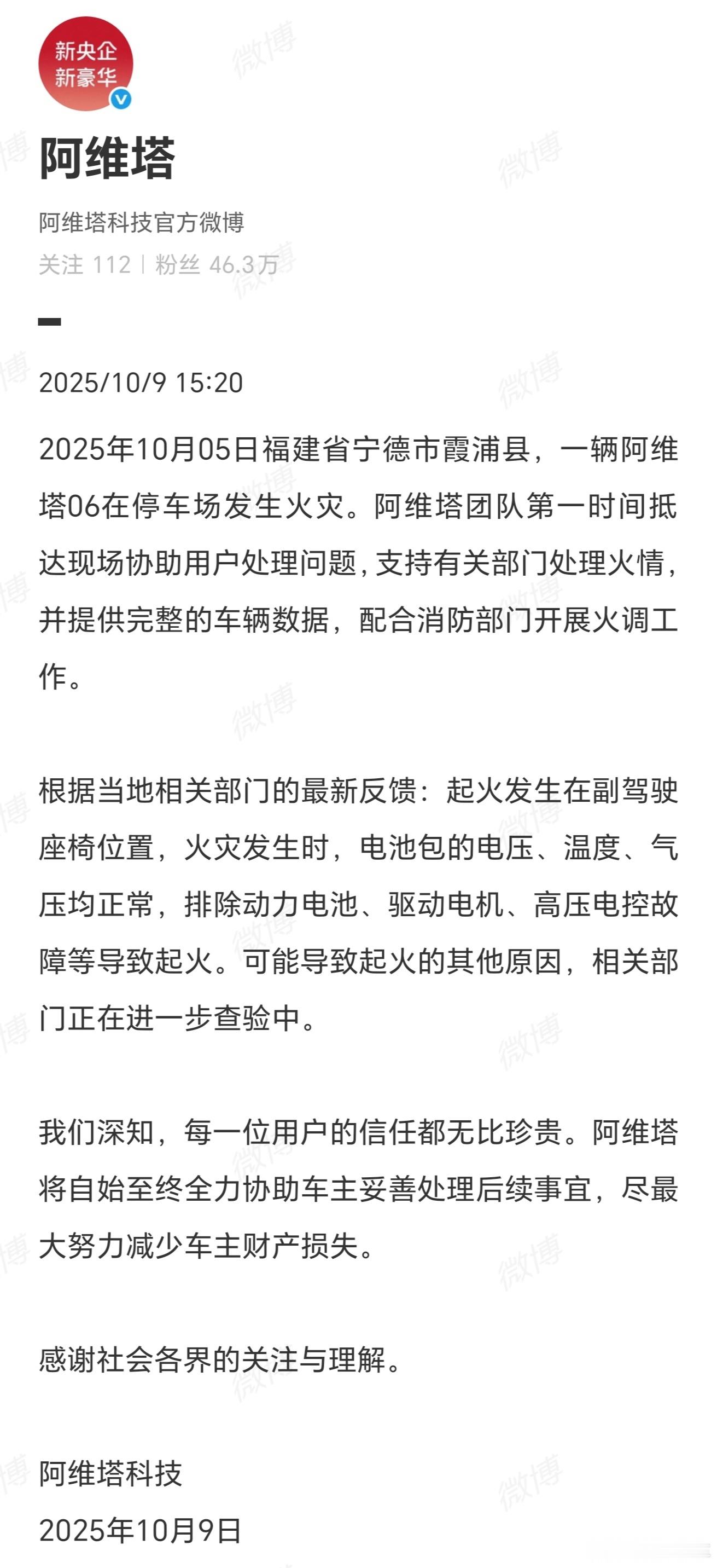 阿维塔回应一车辆起火致7车烧毁阿维塔官方回应起火事件 2025年10月05日福建省宁德市霞浦县,一辆阿维塔06在停车场发生火灾。