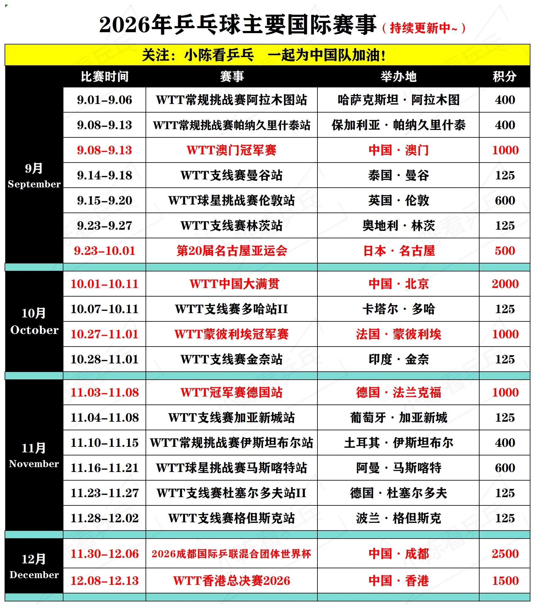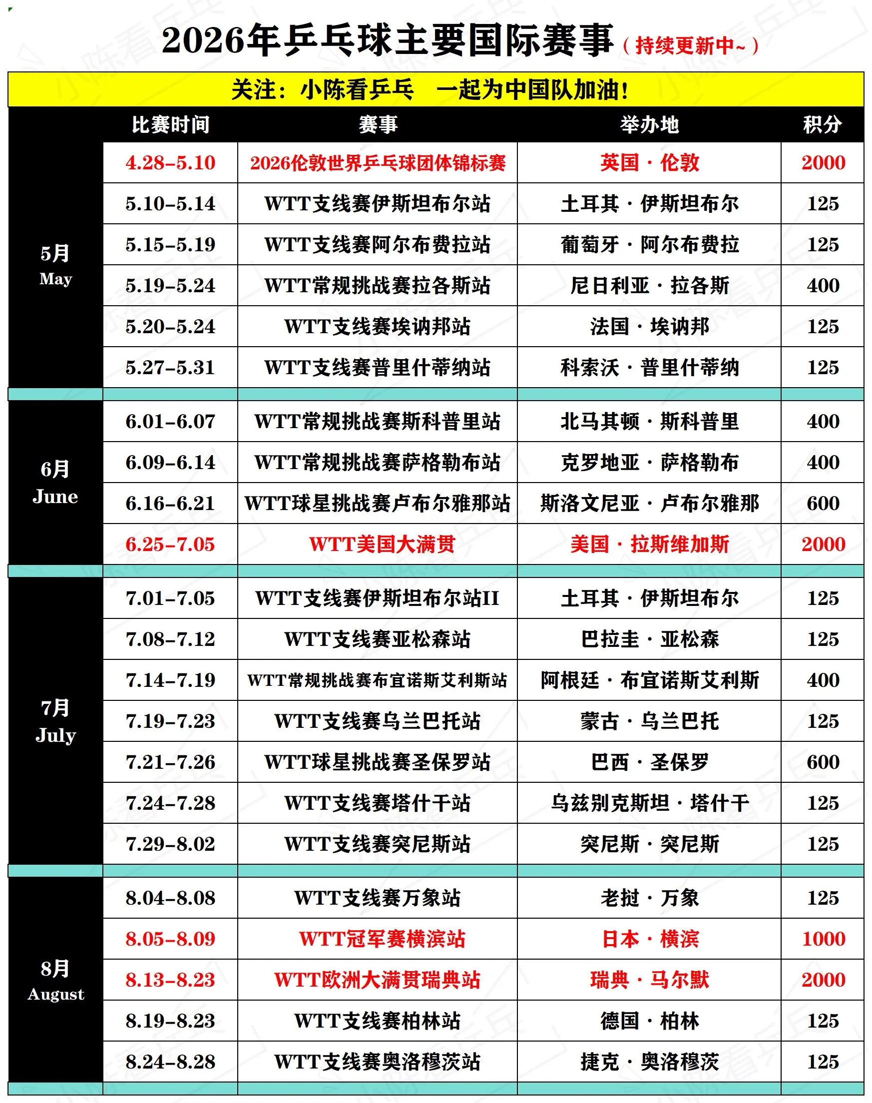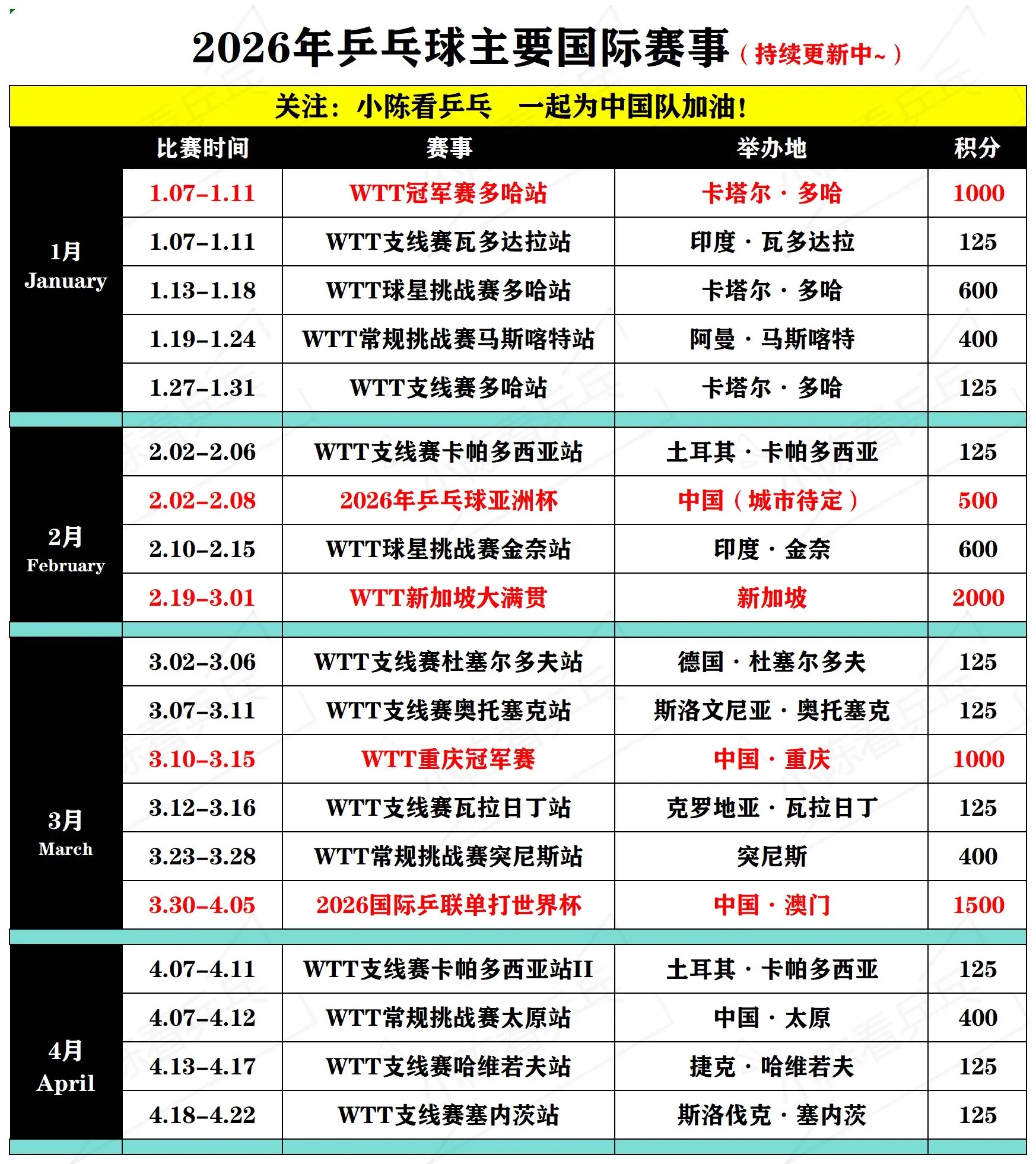 2026年乒乓球主要国际赛事统计~2026年乒乓球主要国际赛事统计,更新中……