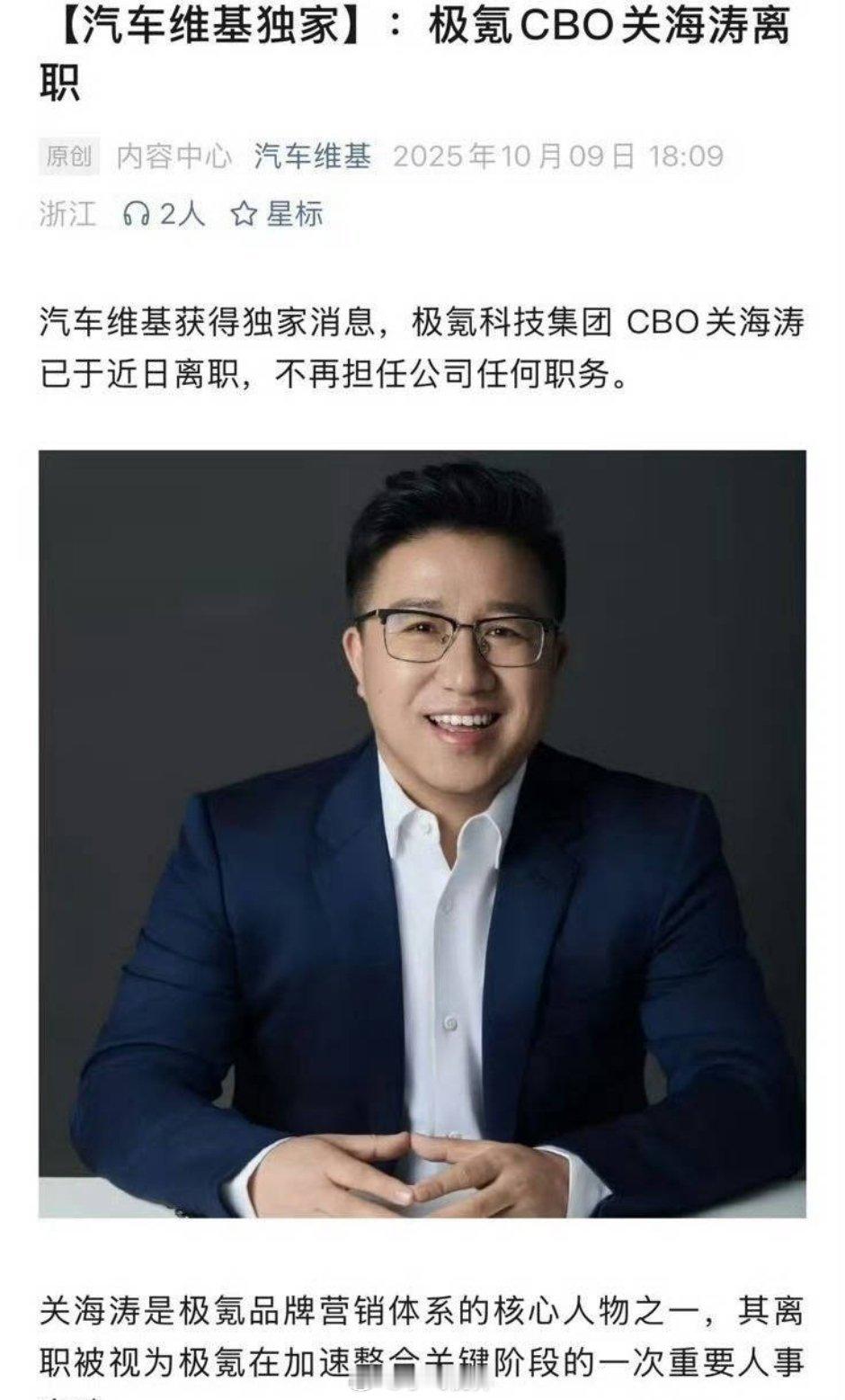 网传极氪CBO关海涛已离职关海涛微博改名这个细节,几乎是职场高管变动的“标准前奏”。