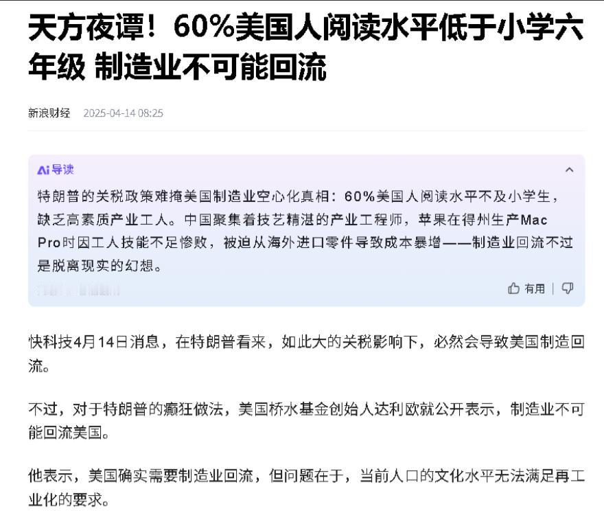美国桥水基金创始人爆料,老美制造业无法回流不是因为受教育程度高,不愿意干!而是因为美国60%人口受教育程度低于小学六年级,干不了!精英永远在哪里都是少数啊!这事儿听起来夸张,但细想还真有点道理。 联合国科教文组织 2020 年的报告明明白白写着,美国文盲率高达 21%,这可不是说完全不识字,按联合国标准,没法通过文字获取信息就算文盲,美国自己的测试更具体,要过三关:认英文、读短文答问题、算数字题,比如看消毒水标签找警告语、算工资条金额、算买菜找零,有一项不过关就算。 而美国教育部 2013 年的调查显示,21% 的人阅读能力低于小学五年级水平,到 2024 年国际成人能力评估更糟,劳动适龄人口里读写能力最低的比例都涨到 28% 了,这些人说是小学六年级水平都算抬举,毕竟连商品标签都看不懂,真进了工厂怕是连安全规程都摸不着头脑。 更讽刺的是美国可是搞了百年以上的 12 年义务教育,理论上人人都该受过完整基础教育,结果愣是养出这么多 “功能性文盲”,说穿了就是教育体系早就积弊难返,表面上上学是义务,实际教得怎么样没人真较真,精英阶层的孩子在私立学校学编程搞科研,底层孩子在公立学校混日子,毕业时连基本的读写算都没过关,这种教育分层直接断了制造业的劳动力根基。 再看制造业的岗位需求,早不是当年插科打诨就能干活的年代了。美国劳工统计局数据显示,现在制造业光空缺岗位就有近 50 万个,制造业协会和德勤的调查里,65% 的企业都喊着招不到人,协会主席卡罗琳・李都说了,一半空缺岗位至少要学士学位,就算剩下的不用学位,也得懂点基础技术,可偏偏这群人最缺。 洛杉矶有家叫 Saitex 的牛仔裤工厂,老板本来想招点本土工人撑场面,结果面试一圈发现,本地人要么连裁剪图纸都看不懂,要么算不清布料用量,最后只能招墨西哥、危地马拉来的移民,这些移民反而成了生产线主力。 开利集团更头疼,生产空调设备的岗位招了大半年,20 份申请里能符合基本要求的就 1 份,董事长季岱维私下吐槽,不是要求高,实在是候选人连简单的设备参数表都读不明白。 这就形成了荒诞的循环:政府喊着制造业回流,企业响应着建工厂,可厂房建好了没人干活。有人说涨工资就行,可问题是涨了工资也没用,工人能力跟不上,生产率上不去,企业成本反而更高,当初这些企业就是因为成本高才搬走的,现在回来等于跳进另一个坑。 更要命的是,美国还在犯糊涂,一边缺工人,一边还打击移民,要知道传统制造业里拉丁裔和非法移民本来就是主力,把这些人赶走,等于把仅有的能干体力活的人也清走了。 复旦大学张家栋教授都看明白了,美国产业工人早就 “脸谱化” 了,本土受教育低的白人嫌工厂累不愿来,有意愿的又干不了,只能靠移民撑着,现在移民渠道堵了,岗位自然就空着。 再说那些所谓的 “精英”,确实是少数,都扎堆在华尔街玩金融、在硅谷搞互联网,谁愿意去工厂管生产线?就算有企业想搞自动化替代人工,可工业机器人数量连韩国都不如,操作机器人还得懂编程维护,这又绕回了技术工人短缺的老问题。 美国教育部自己都承认,近几十年来文盲率一直没降,反而在升,1950 年的时候美国识字率还 90% 以上,70 年过去科技发达了,识字率反倒跌到 79%,这教育质量真是越教越回去了。 那些喊着 “制造业振兴” 的政客,怕是没去过工厂车间,不知道现在拧螺丝都要懂传感器数据,不是光有膀子力气就行,而他们口中的 “美国人民”,有近三成人连最简单的读写都成问题,真把工厂搬回来,难道让机器自己干活? 所以说不是美国人娇气不愿意干,是真没那个本事干。你让一个连工资单都算不清的人去操作精密机床,让一个看不懂设备说明书的人去维护生产线,这不等于让旱鸭子去游泳?移民能顶一阵子,但解决不了根本,毕竟移民群体的教育水平也有限,高端制造岗位照样没人填。 政府一边砸钱建工厂,一边不抓基础教育,就像盖房子只搭架子不打地基,看着热闹,实则一推就倒。 那些嘲笑别人 “愿意干却没机会” 的人,怕是没见过美国工人连基础测试都过不了的窘境,这哪儿是没机会,分明是能力配不上机会。精英永远在金字塔尖,但制造业需要的是塔基的熟练劳动力,塔基都烂了,再漂亮的塔尖也撑不起制造业回流的架子。
