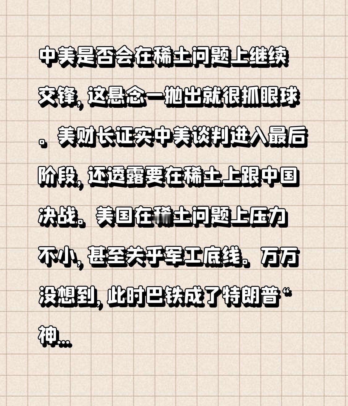 中美是否会在稀土问题上继续交锋,这悬念一抛出就很抓眼球。美财长证实中美谈判进入最后阶段,还透露要在稀土上跟中国决战。美国在稀土问题上压力不小,甚至关乎军工底线。 万万没想到,此时巴铁成了特朗普“神助攻”。巴基斯坦总理和陆军参谋长访美,还带去本国开采的稀土样品。此前美巴已签矿产协议备忘录,美国USSM公司会投入5亿美元用于勘查,后续还协助建加工厂。不过合作地区安全环境不佳,美国企业也很谨慎。 中美稀土交锋后续会如何发展?美国能否通过与巴铁合作缓解稀土需求?中巴在稀土领域又会有怎样的互动? 美国稀土需求 中国对美稀土 中美稀土之争 美国稀土订单 中方稀土战略 美国稀土战略 美国稀土