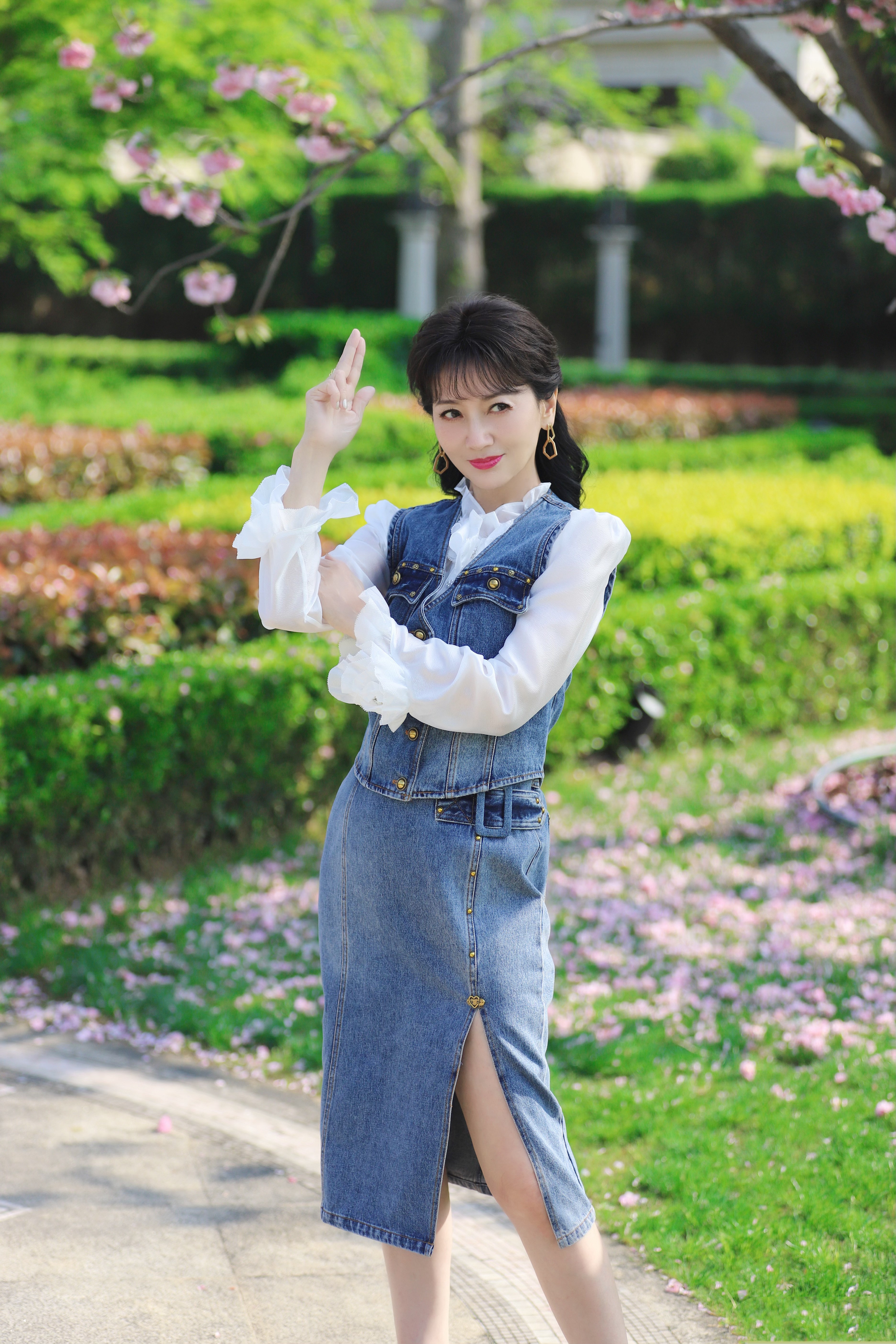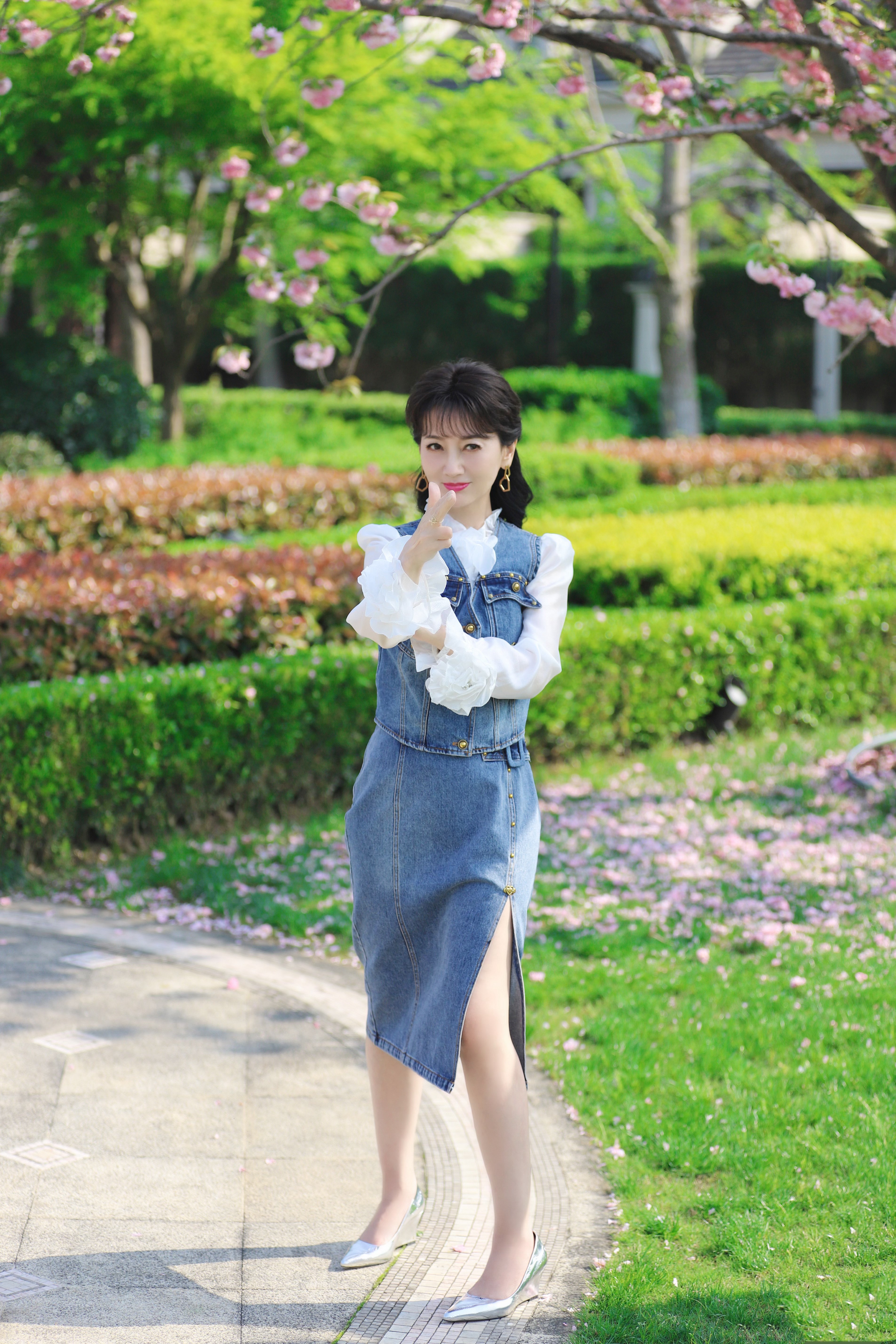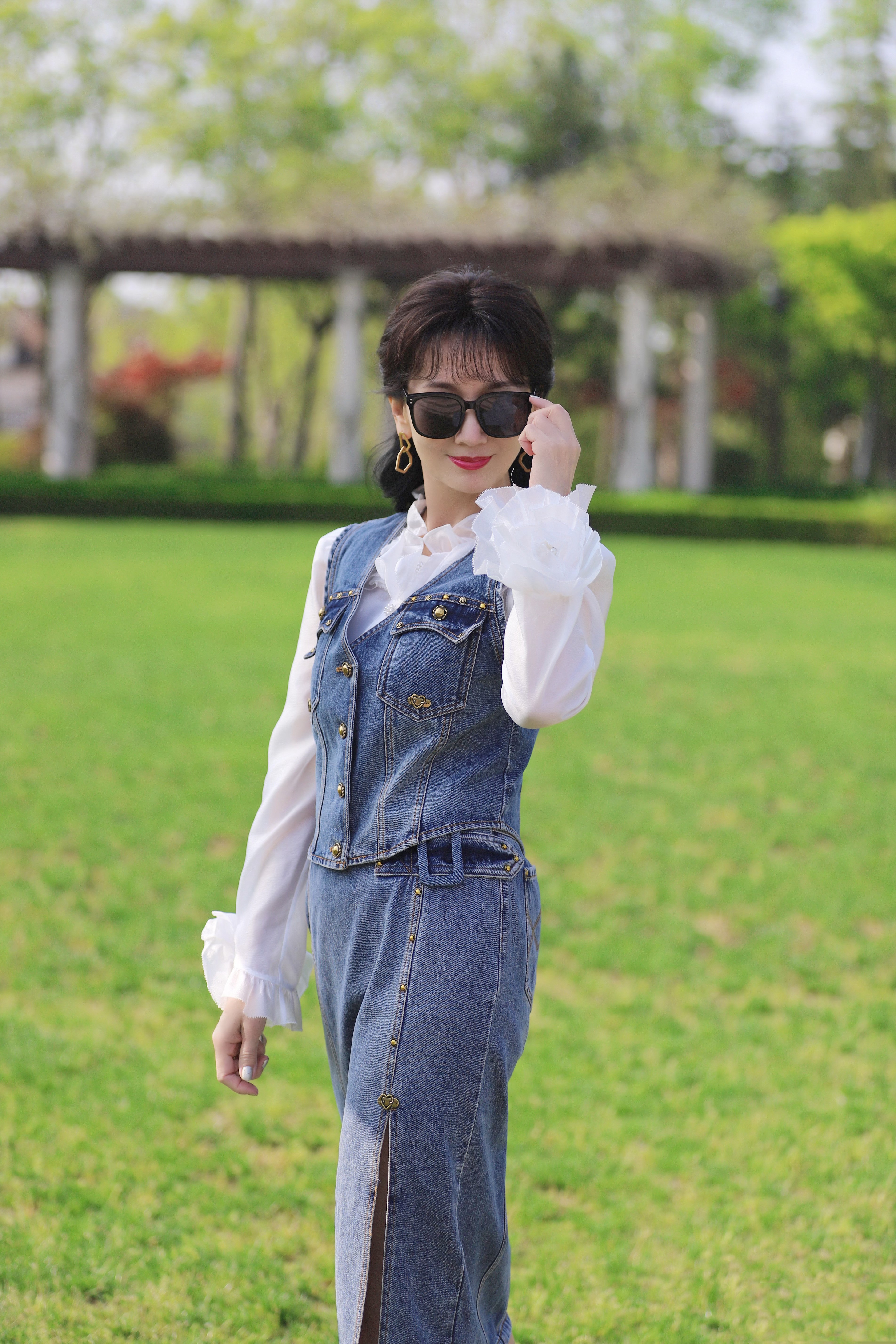 赵雅芝,蓝与白的色调穿搭,真的好优雅