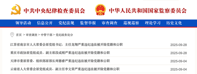 此外还有:中国工商银行河南省分行原党委书记、行长许杰被开除党籍;青海省西宁市委原常委、秘书长、一级巡视员管新民被开除党籍;云南省普洱市人大常委会原党组成员、副主任魏刚被开除党籍和公职;原湖南建工集团有限公司党委委员、副总经理谈毅被开除党籍;贵州省毕节市委原常委、统战部部长潘发勇被开除党籍和公职;等等。