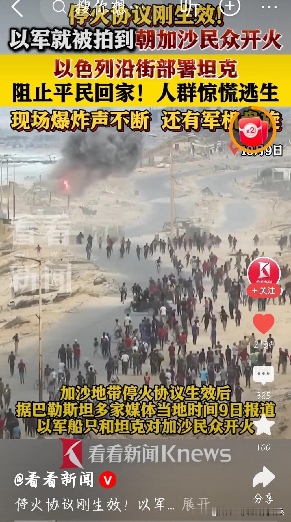 停火了还不让回家?以色列坦克堵路,加沙人有家难回 刚生效的停火协议,在加沙拉希德街成了笑话。想回北部加沙城的平民,全被沿街部署的以色列坦克拦住了。 视频里看得清清楚楚,坦克直接朝人群警告性开火,爆炸声一响,人们吓得四散逃跑,空中还有军机盘旋。这些人背着行李、抱着孩子,只是想回自己住了一辈子的家,却要冒着生命危险。 之前停火协议明明说好了让民众返乡,结果以军根本没撤,还找各种理由拦着。家就在眼前,却被坦克挡着过不去,这种滋味太难受了。 说好的和平影子都没见着,倒是先把回家的路堵死了,谁能甘心?巴勒斯坦国 加沙局势 加沙流离失所 加沙停火 曝以色列部署坦克阻止加沙平民回家