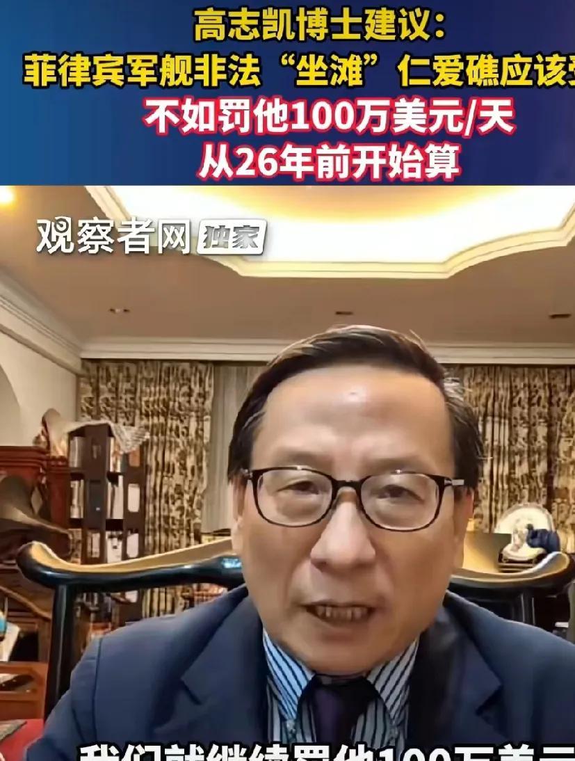 高志凯这个建议应该没有中国人会反对! 高志凯建议对仁爱礁的坐滩舰进行罚款每天100万美元,这个办法确实可以试试。处罚很好解释,汽车不按规定违章了也会处罚,深圳的车停错了地方都是500块一次,他们停了26年,按天算没毛病! 每天100美元,算下来90多亿美元,也能造将近10艘055了,只有罚到肉疼他们才会长记性!