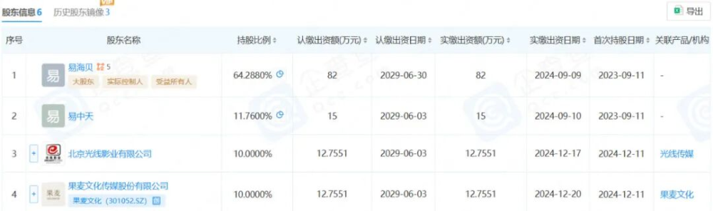 其女易海贝为公司法人,曾是万科高级合伙人,2023年离职创业,父女俩合计持股约76%,王长田也通过光线影业持股10%,进行绑定。