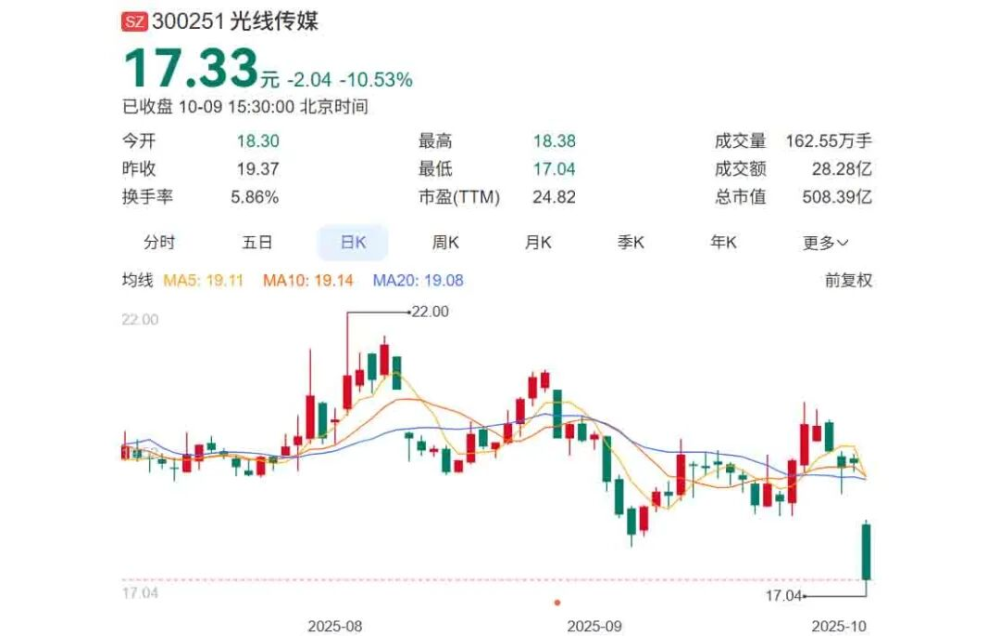 10月9日,光线传媒开盘即重挫,至收盘市值508亿,全天蒸发约60亿元,按照股比,王氏家族一天浮亏25亿左右,但身家仍在200亿以上。