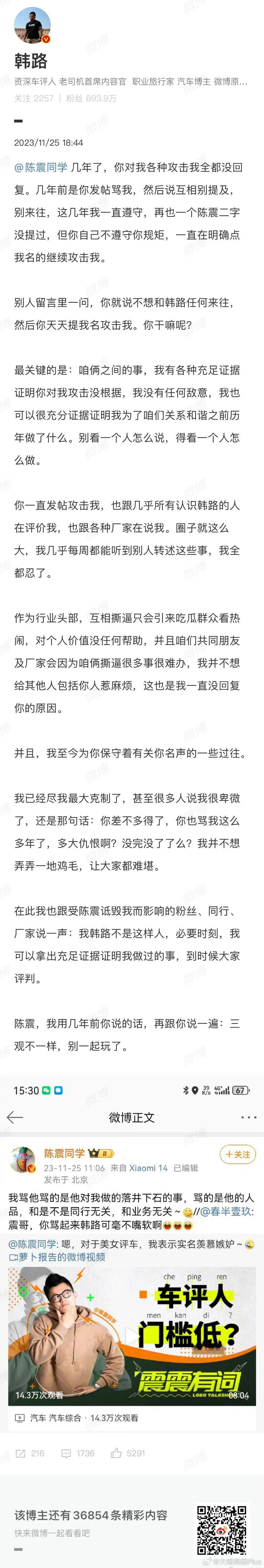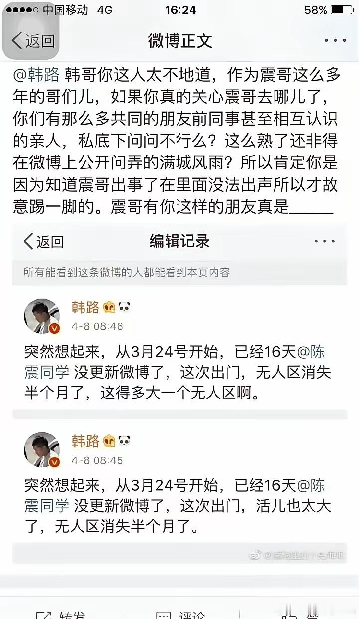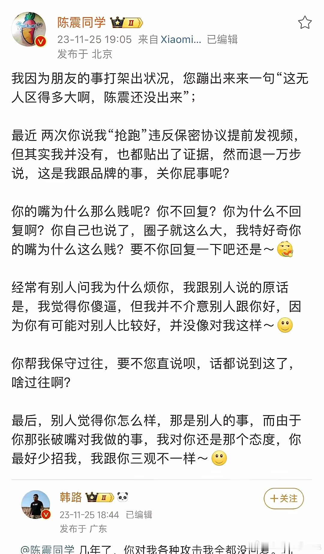 大v透露了韩路、陈震当年结仇的原因,是因为陈震当年打架进去了,韩路落井下石的进行